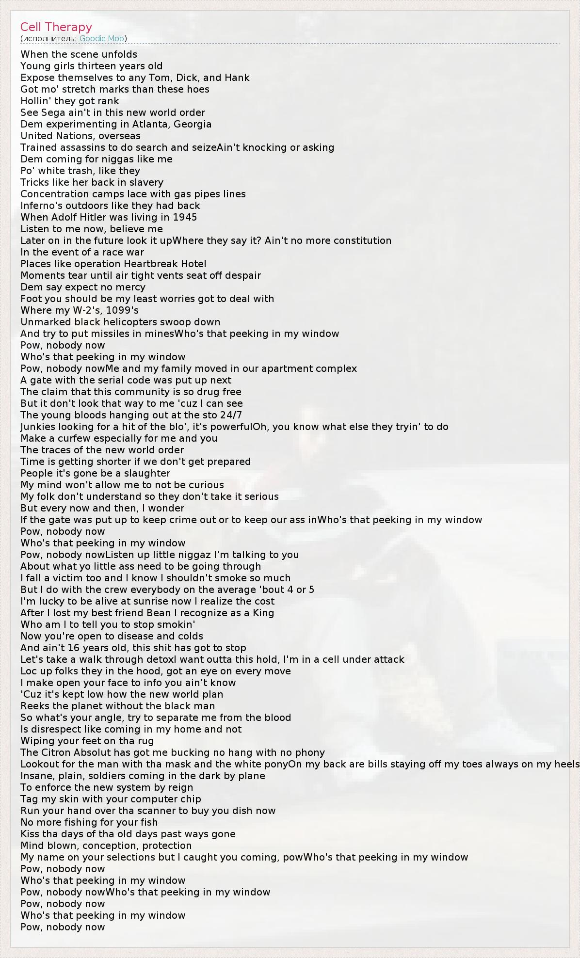 Это интересно:Goodie Mob - рэпперы из Атланты, почитаемы, как одна из наиболее “правильных” групп Южной сцены, своим появлением, в 1995 году, открывшая путь в хип-хоп многим южным бандам.В состав группы вошли, рэпперы Cee-Lo, Khujo, T-Mo и Big Gipp.Дебютный альбом "Soul Food", выпущенный в 1995, является одним из самых ранних Южных альбомов, появившихся на главном лэйбле и на ряду с дебютом рэп группы OutKast по существу... продолжение