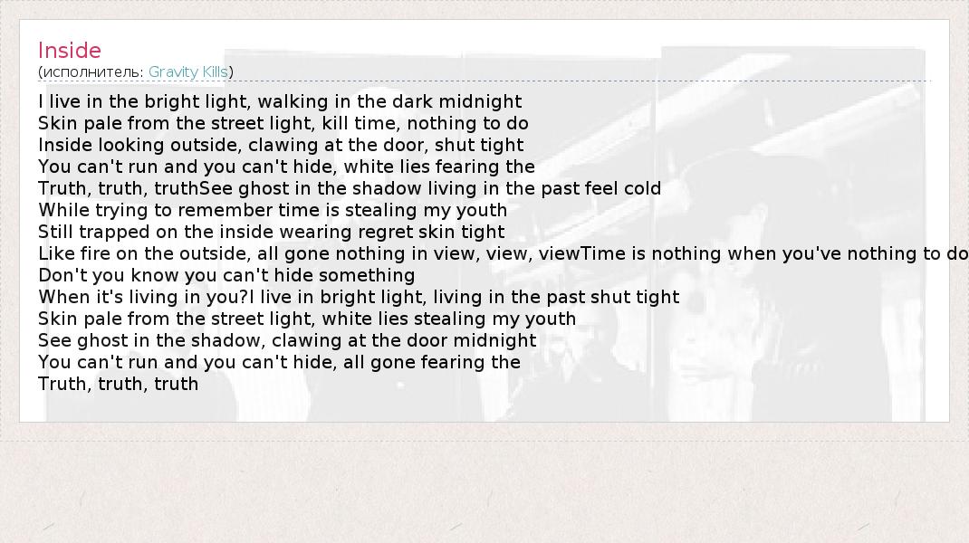Truth, truth, truthSee ghost in the shadow living in the past feel cold