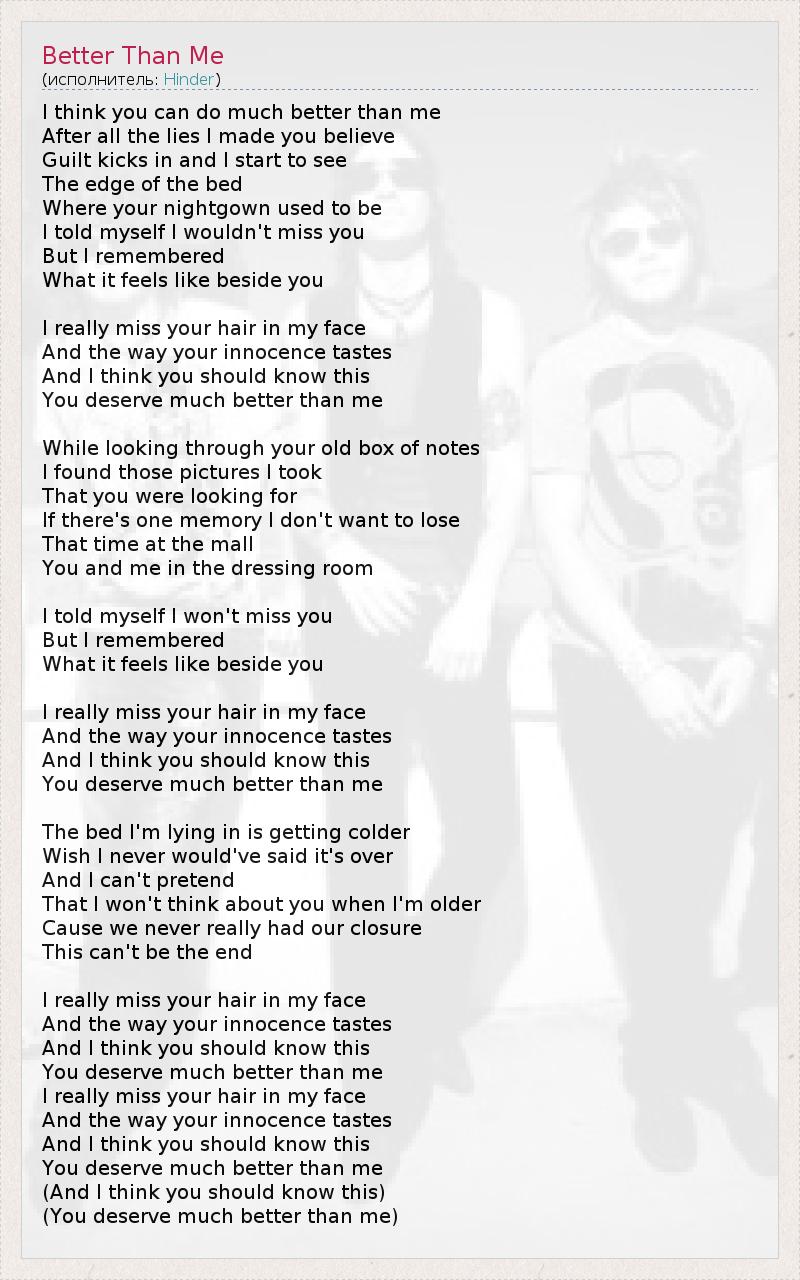 Я думаю, тебе будет гораздо лучше, чем мне После всей той лжи, в которую я заставлял тебя верить. Чувство вины гложет меня, и я начинаю смотреть На край кровати, Где обычно висела твоя сорочка. Я твердил себе, что не буду скучать по тебе, Но я запомнил, Каково это - быть рядом с тобой. Я действительно скучаю по возможности спрятать лицо в твоих волосах, И по вкусу твоей чистоты. Я думаю, ты должна знать, что Ты заслуживаешь кого-то гораздо лучше меня. Пока я рассматривал твою старую коробку с записями, Я нашел фотографии, что я сделал, Которые ты искала. Если и есть какое-то воспоминание, которое я не хочу потерять, Это тот раз в супермаркете, Ты и я в примерочной. Я твердил себе, что не буду скучать по тебе, Но я запомнил, Каково это - быть рядом с тобой. Я действительно скучаю по возможности спрятать лицо в твоих волосах, И по вкусу твоей чистоты. И я думаю, ты должна знать, что Ты заслуживаешь кого-то гораздо лучше меня. Постель, на которой я лежу, становится холоднее, Лучше бы я не произнёс этих слов: "Все кончено", И я не могу притвориться, Что не буду думать о тебе спустя годы, Ведь мы толком и не расстались, Не может быть, что это конец. Я действительно скучаю по возможности спрятать лицо в твоих волосах, И по вкусу твоей чистоты. И я думаю, ты должна знать, что Ты заслуживаешь кого-то гораздо лучше меня. Я действительно скучаю по возможности спрятать лицо в твоих волосах, И по вкусу твоей чистоты. И я думаю, ты должна знать, что Ты заслуживаешь кого-то гораздо лучше меня. (И я думаю, ты должна знать это) (Ты заслуживаешь кого-то гораздо лучше меня.)