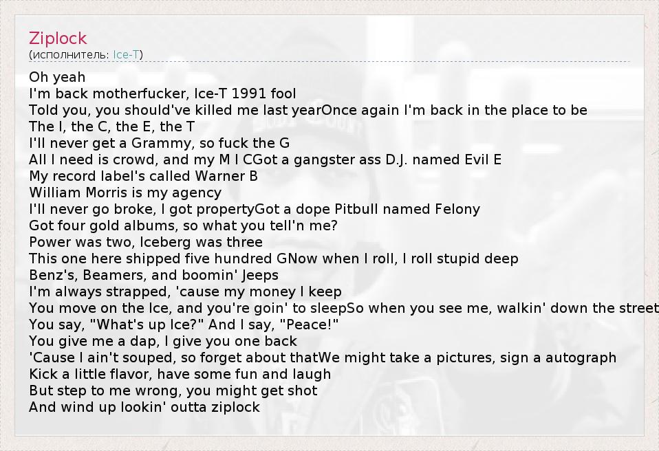 Это интересно:Ice-T (настоящее имя Tracy Morrow, родился 16 февраля 1958 года, в Ньюарк (Newark), Нью-Джерси, США) является одним из самых внятных и интеллектуальных звезд хип-хоп музыки, так же он известен как один из самых печальных поэтов. В своих лучших произведениях, рэппер очень тонко описал портреты жизни гетто и гангстеров. Он задевал темы дискриминации и насилия, и даже тогда его рифмы были умны и резки. Лучшие... продолжение