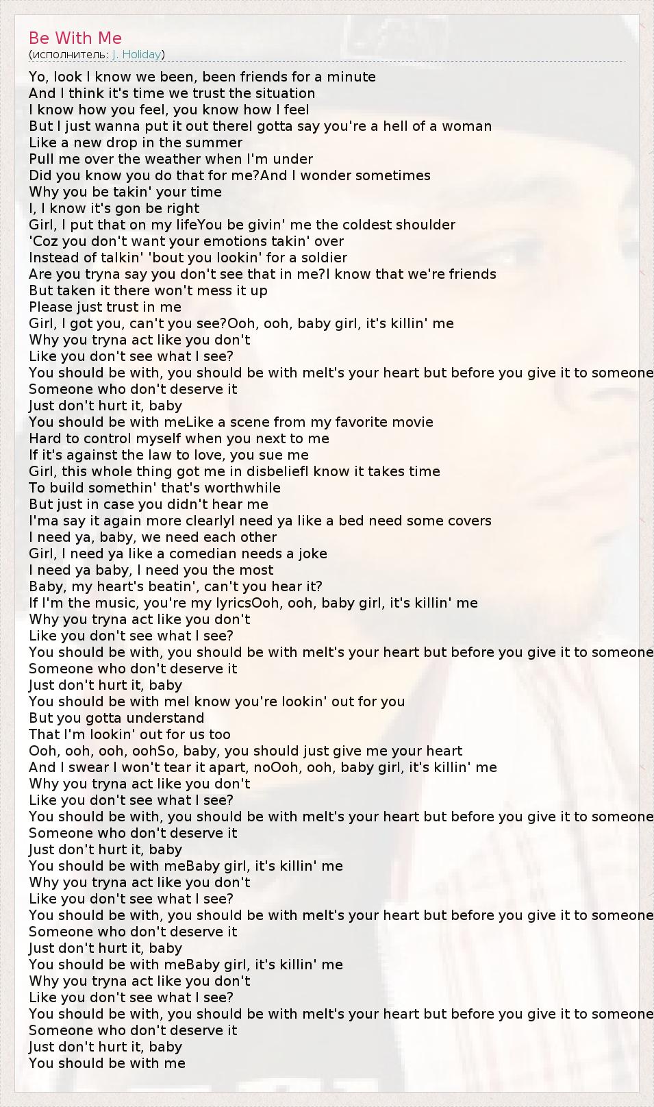 Это интересно:J. Holiday (Нахум Гримес) родился 29 ноября 1984 года в Вашингтоне, Колумбия, r'n'b исполнитель. Джей стал победителем среди многочисленных талантливых ребят в местном конкурсе. И позже попал в группу 295, организованной в Вашингтоне. позже Ждей со своим коллективом переехал в Атланту, штат Джорджия. Где и живет по сей день. В 2006 году при поддержке Rodney "Darkchild" Jerkins выходит... продолжение
