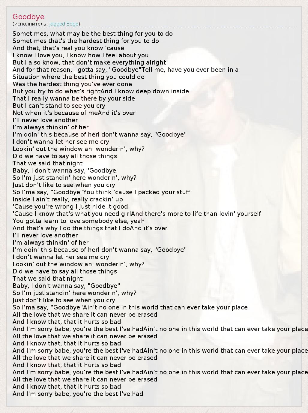 Sometimes, what may be the best thing for you to do Sometimes that's the hardest thing for you to do And that, that's real you know 'cause I know I love you, I know how I feel about you But I also know, that don't make everything alright And for that reason, I gotta say, "Goodbye"Tell me, have you ever been in a Situation where the best thing you could do Was the hardest thing you've ever done But you try to do what's rightAnd I know deep down inside That I really wanna be there by your side But I can't stand to see you cry Not when it's because of meAnd it's over I'll never love another I'm always thinkin' of her I'm doin' this because of herI don't wanna say, "Goodbye" I don't wanna let her see me cry Lookin' out the window an' wonderin', why? Did we have to say all those things That we said that night Baby, I don't wanna say, 'Goodbye' So I'm just standin' here wonderin', why? Just don't like to see when you cry So I'ma say, "Goodbye"You think 'cause I packed your stuff Inside I ain't really, really crackin' up 'Cause you're wrong I just hide it good 'Cause I know that's what you need girlAnd there's more to life than lovin' yourself You gotta learn to love somebody else, yeah And that's why I do the things that I doAnd it's over I'll never love another I'm always thinkin' of her I'm doin' this because of herI don't wanna say, "Goodbye" I don't wanna let her see me cry Lookin' out the window an' wonderin', why? Did we have to say all those things That we said that night Baby, I don't wanna say, "Goodbye" So I'm just standin' here wonderin', why? Just don't like to see when you cry So I'ma say, "Goodbye"Ain't no one in this world that can ever take your place All the love that we share it can never be erased And I know that, that it hurts so bad And I'm sorry babe, you're the best I've hadAin't no one in this world that can ever take your place All the love that we share it can never be erased And I know that, that it hurts so bad And I'm sorry babe, you're the best I've hadAin't no one in this world that can ever take your place All the love that we share it can never be erased And I know that, that it hurts so bad And I'm sorry babe, you're the best I've hadAin't no one in this world that can ever take your place All the love that we share it can never be erased And I know that, that it hurts so bad And I'm sorry babe, you're the best I've had