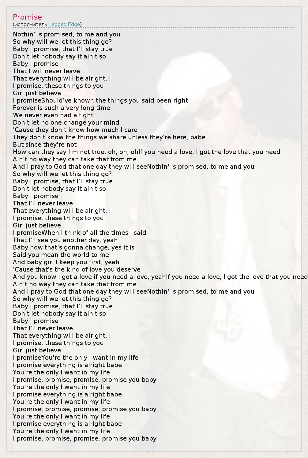 Nothin' is promised, to me and you So why will we let this thing go? Baby I promise, that I'll stay true Don't let nobody say it ain't so Baby I promise That I will never leave That everything will be alright, I I promise, these things to you Girl just believe I promiseShould've known the things you said been right Forever is such a very long time We never even had a fight Don't let no one change your mind 'Cause they don't know how much I care They don't know the things we share unless they're here, babe But since they're not How can they say I'm not true, oh, oh, ohIf you need a love, I got the love that you need Ain't no way they can take that from me And I pray to God that one day they will seeNothin' is promised, to me and you So why will we let this thing go? Baby I promise, that I'll stay true Don't let nobody say it ain't so Baby I promise That I'll never leave That everything will be alright, I I promise, these things to you Girl just believe I promiseWhen I think of all the times I said That I'll see you another day, yeah Baby now that's gonna change, yes it is Said you mean the world to me And baby girl I keep you first, yeah 'Cause that's the kind of love you deserve And you know I got a love if you need a love, yeahIf you need a love, I got the love that you need Ain't no way they can take that from me And I pray to God that one day they will seeNothin' is promised, to me and you So why will we let this thing go? Baby I promise, that I'll stay true Don't let nobody say it ain't so Baby I promise That I'll never leave That everything will be alright, I I promise, these things to you Girl just believe I promiseYou're the only I want in my life I promise everything is alright babe You're the only I want in my life I promise, promise, promise, promise you baby You're the only I want in my life I promise everything is alright babe You're the only I want in my life I promise, promise, promise, promise you baby You're the only I want in my life I promise everything is alright babe You're the only I want in my life I promise, promise, promise, promise you baby