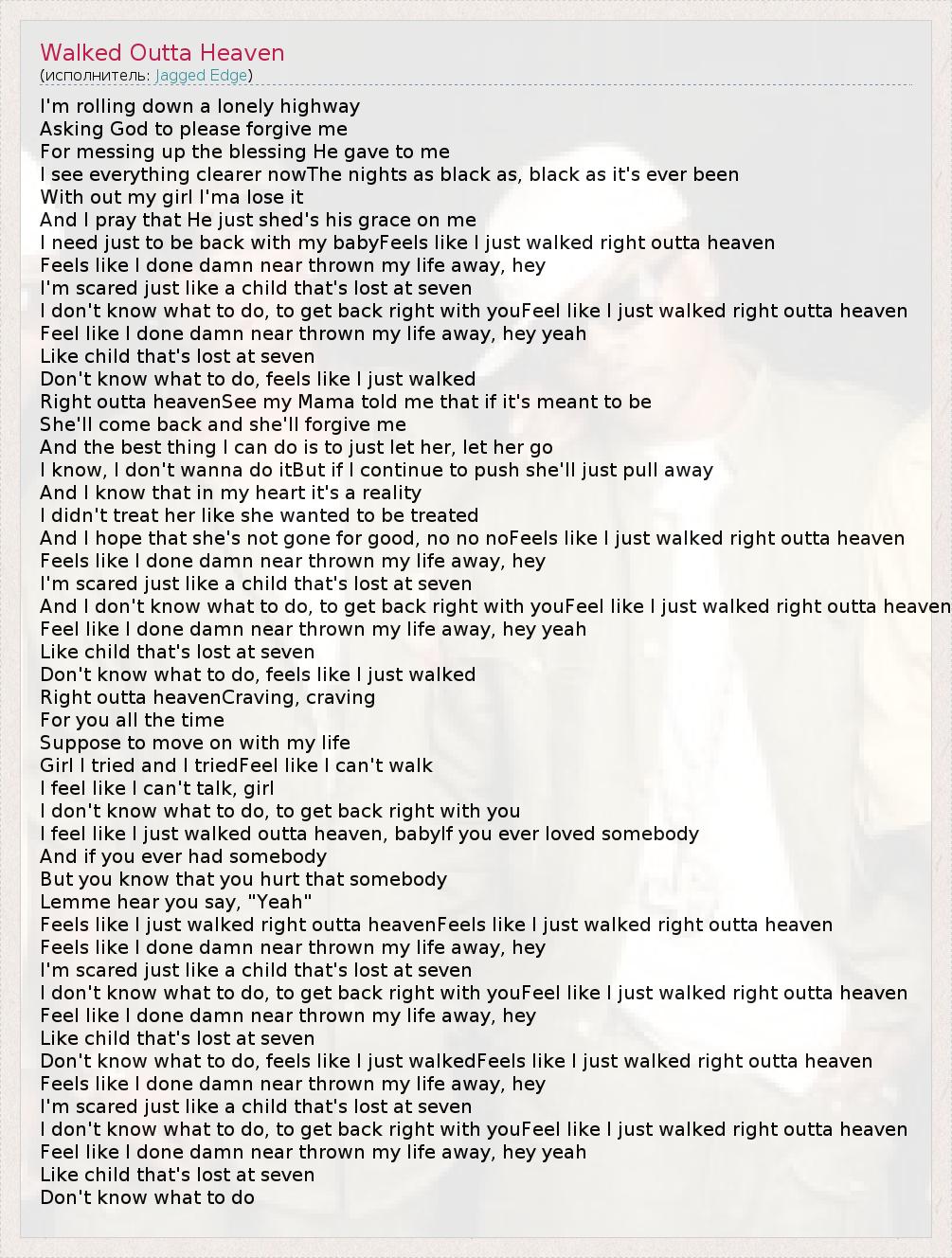 I'm rolling down a lonely highway Asking God to please forgive me For messing up the blessing He gave to me I see everything clearer nowThe nights as black as, black as it's ever been With out my girl I'ma lose it And I pray that He just shed's his grace on me I need just to be back with my babyFeels like I just walked right outta heaven Feels like I done damn near thrown my life away, hey I'm scared just like a child that's lost at seven I don't know what to do, to get back right with youFeel like I just walked right outta heaven Feel like I done damn near thrown my life away, hey yeah Like child that's lost at seven Don't know what to do, feels like I just walked Right outta heavenSee my Mama told me that if it's meant to be She'll come back and she'll forgive me And the best thing I can do is to just let her, let her go I know, I don't wanna do itBut if I continue to push she'll just pull away And I know that in my heart it's a reality I didn't treat her like she wanted to be treated And I hope that she's not gone for good, no no noFeels like I just walked right outta heaven Feels like I done damn near thrown my life away, hey I'm scared just like a child that's lost at seven And I don't know what to do, to get back right with youFeel like I just walked right outta heaven Feel like I done damn near thrown my life away, hey yeah Like child that's lost at seven Don't know what to do, feels like I just walked Right outta heavenCraving, craving For you all the time Suppose to move on with my life Girl I tried and I triedFeel like I can't walk I feel like I can't talk, girl I don't know what to do, to get back right with you I feel like I just walked outta heaven, babyIf you ever loved somebody And if you ever had somebody But you know that you hurt that somebody Lemme hear you say, "Yeah" Feels like I just walked right outta heavenFeels like I just walked right outta heaven Feels like I done damn near thrown my life away, hey I'm scared just like a child that's lost at seven I don't know what to do, to get back right with youFeel like I just walked right outta heaven Feel like I done damn near thrown my life away, hey Like child that's lost at seven Don't know what to do, feels like I just walkedFeels like I just walked right outta heaven Feels like I done damn near thrown my life away, hey I'm scared just like a child that's lost at seven I don't know what to do, to get back right with youFeel like I just walked right outta heaven Feel like I done damn near thrown my life away, hey yeah Like child that's lost at seven Don't know what to do