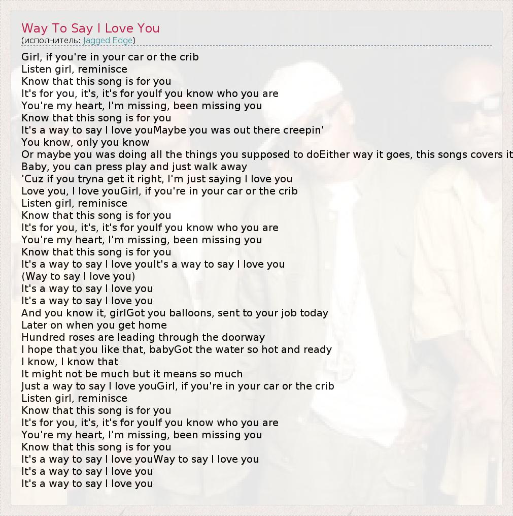 Girl, if you're in your car or the crib Listen girl, reminisce Know that this song is for you It's for you, it's, it's for youIf you know who you are You're my heart, I'm missing, been missing you Know that this song is for you It's a way to say I love youMaybe you was out there creepin' You know, only you know Or maybe you was doing all the things you supposed to doEither way it goes, this songs covers it Baby, you can press play and just walk away 'Cuz if you tryna get it right, I'm just saying I love you Love you, I love youGirl, if you're in your car or the crib Listen girl, reminisce Know that this song is for you It's for you, it's, it's for youIf you know who you are You're my heart, I'm missing, been missing you Know that this song is for you It's a way to say I love youIt's a way to say I love you (Way to say I love you) It's a way to say I love you It's a way to say I love you And you know it, girlGot you balloons, sent to your job today Later on when you get home Hundred roses are leading through the doorway I hope that you like that, babyGot the water so hot and ready I know, I know that It might not be much but it means so much Just a way to say I love youGirl, if you're in your car or the crib Listen girl, reminisce Know that this song is for you It's for you, it's, it's for youIf you know who you are You're my heart, I'm missing, been missing you Know that this song is for you It's a way to say I love youWay to say I love you It's a way to say I love you It's a way to say I love you