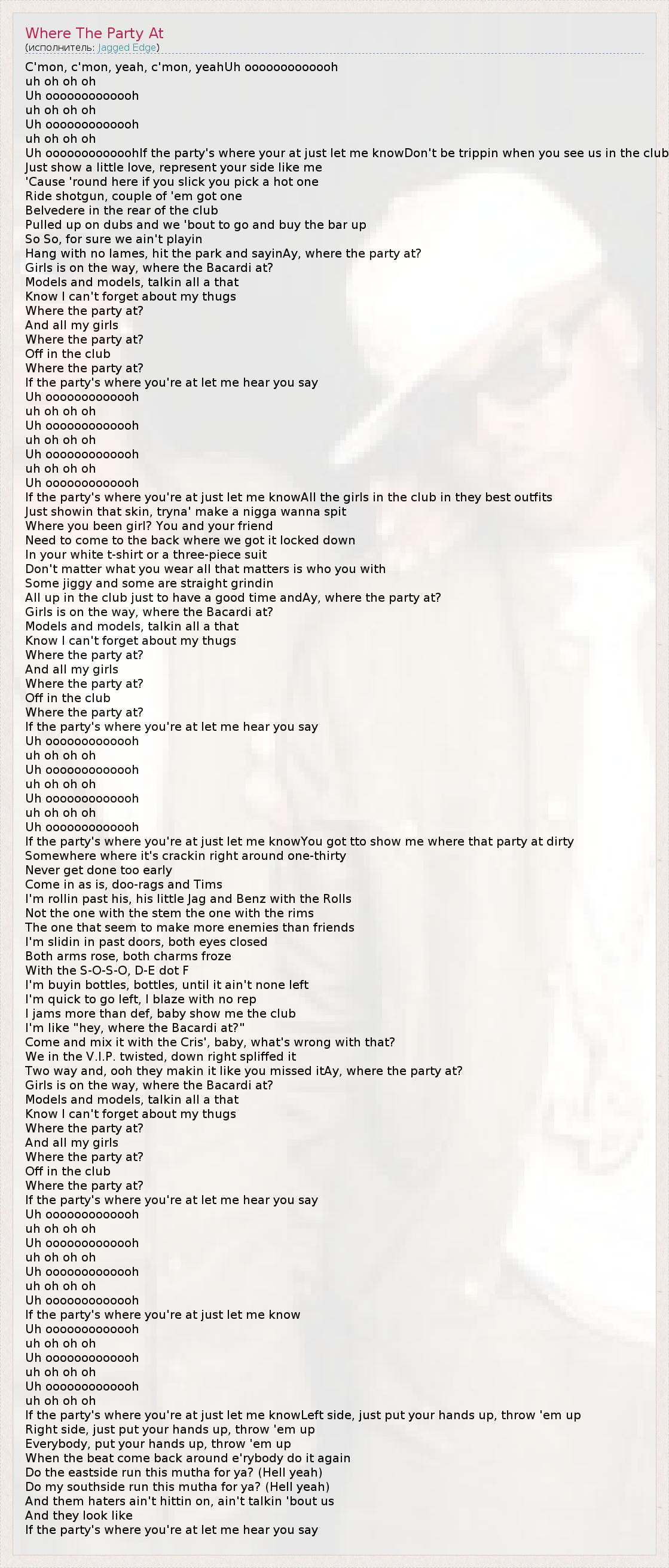 C'mon, c'mon, yeah, c'mon, yeahUh ooooooooooooh uh oh oh oh Uh ooooooooooooh uh oh oh oh Uh ooooooooooooh uh oh oh oh Uh oooooooooooohIf the party's where your at just let me knowDon't be trippin when you see us in the club Just show a little love, represent your side like me 'Cause 'round here if you slick you pick a hot one Ride shotgun, couple of 'em got one Belvedere in the rear of the club Pulled up on dubs and we 'bout to go and buy the bar up So So, for sure we ain't playin Hang with no lames, hit the park and sayinAy, where the party at? Girls is on the way, where the Bacardi at? Models and models, talkin all a that Know I can't forget about my thugs Where the party at? And all my girls Where the party at? Off in the club Where the party at? If the party's where you're at let me hear you say Uh ooooooooooooh uh oh oh oh Uh ooooooooooooh uh oh oh oh Uh ooooooooooooh uh oh oh oh Uh ooooooooooooh If the party's where you're at just let me knowAll the girls in the club in they best outfits Just showin that skin, tryna' make a nigga wanna spit Where you been girl? You and your friend Need to come to the back where we got it locked down In your white t-shirt or a three-piece suit Don't matter what you wear all that matters is who you with Some jiggy and some are straight grindin All up in the club just to have a good time andAy, where the party at? Girls is on the way, where the Bacardi at? Models and models, talkin all a that Know I can't forget about my thugs Where the party at? And all my girls Where the party at? Off in the club Where the party at? If the party's where you're at let me hear you say Uh ooooooooooooh uh oh oh oh Uh ooooooooooooh uh oh oh oh Uh ooooooooooooh uh oh oh oh Uh ooooooooooooh If the party's where you're at just let me knowYou got tto show me where that party at dirty Somewhere where it's crackin right around one-thirty Never get done too early Come in as is, doo-rags and Tims I'm rollin past his, his little Jag and Benz with the Rolls Not the one with the stem the one with the rims The one that seem to make more enemies than friends I'm slidin in past doors, both eyes closed Both arms rose, both charms froze With the S-O-S-O, D-E dot F I'm buyin bottles, bottles, until it ain't none left I'm quick to go left, I blaze with no rep I jams more than def, baby show me the club I'm like "hey, where the Bacardi at?" Come and mix it with the Cris', baby, what's wrong with that? We in the V.I.P. twisted, down right spliffed it Two way and, ooh they makin it like you missed itAy, where the party at? Girls is on the way, where the Bacardi at? Models and models, talkin all a that Know I can't forget about my thugs Where the party at? And all my girls Where the party at? Off in the club Where the party at? If the party's where you're at let me hear you say Uh ooooooooooooh uh oh oh oh Uh ooooooooooooh uh oh oh oh Uh ooooooooooooh uh oh oh oh Uh ooooooooooooh If the party's where you're at just let me know Uh ooooooooooooh uh oh oh oh Uh ooooooooooooh uh oh oh oh Uh ooooooooooooh uh oh oh oh If the party's where you're at just let me knowLeft side, just put your hands up, throw 'em up Right side, just put your hands up, throw 'em up Everybody, put your hands up, throw 'em up When the beat come back around e'rybody do it again Do the eastside run this mutha for ya? (Hell yeah) Do my southside run this mutha for ya? (Hell yeah) And them haters ain't hittin on, ain't talkin 'bout us And they look like If the party's where you're at let me hear you say