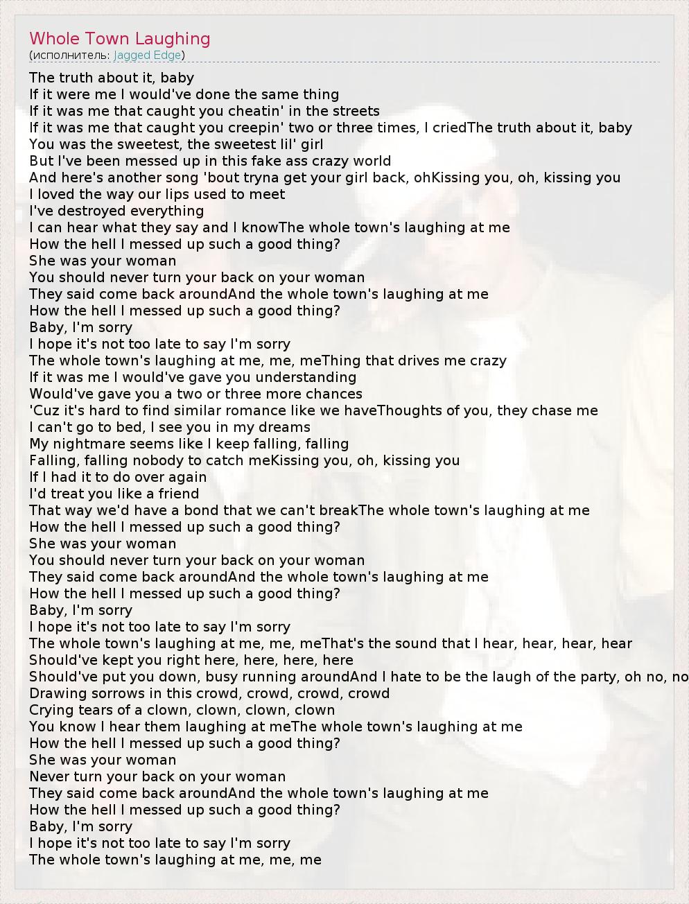 The truth about it, baby If it were me I would've done the same thing If it was me that caught you cheatin' in the streets If it was me that caught you creepin' two or three times, I criedThe truth about it, baby You was the sweetest, the sweetest lil' girl But I've been messed up in this fake ass crazy world And here's another song 'bout tryna get your girl back, ohKissing you, oh, kissing you I loved the way our lips used to meet I've destroyed everything I can hear what they say and I knowThe whole town's laughing at me How the hell I messed up such a good thing? She was your woman You should never turn your back on your woman They said come back aroundAnd the whole town's laughing at me How the hell I messed up such a good thing? Baby, I'm sorry I hope it's not too late to say I'm sorry The whole town's laughing at me, me, meThing that drives me crazy If it was me I would've gave you understanding Would've gave you a two or three more chances 'Cuz it's hard to find similar romance like we haveThoughts of you, they chase me I can't go to bed, I see you in my dreams My nightmare seems like I keep falling, falling Falling, falling nobody to catch meKissing you, oh, kissing you If I had it to do over again I'd treat you like a friend That way we'd have a bond that we can't breakThe whole town's laughing at me How the hell I messed up such a good thing? She was your woman You should never turn your back on your woman They said come back aroundAnd the whole town's laughing at me How the hell I messed up such a good thing? Baby, I'm sorry I hope it's not too late to say I'm sorry The whole town's laughing at me, me, meThat's the sound that I hear, hear, hear, hear Should've kept you right here, here, here, here Should've put you down, busy running aroundAnd I hate to be the laugh of the party, oh no, no Drawing sorrows in this crowd, crowd, crowd, crowd Crying tears of a clown, clown, clown, clown You know I hear them laughing at meThe whole town's laughing at me How the hell I messed up such a good thing? She was your woman Never turn your back on your woman They said come back aroundAnd the whole town's laughing at me How the hell I messed up such a good thing? Baby, I'm sorry I hope it's not too late to say I'm sorry The whole town's laughing at me, me, me