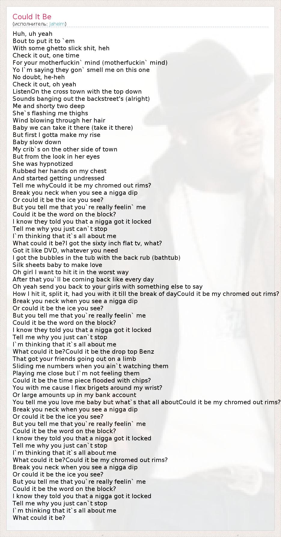 Huh, uh yeah Bout to put it to `em With some ghetto slick shit, heh Check it out, one time For your motherfuckin` mind (motherfuckin` mind) Yo I`m saying they gon` smell me on this one No doubt, he-heh Check it out, oh yeah ListenOn the cross town with the top down Sounds banging out the backstreet's (alright) Me and shorty two deep She`s flashing me thighs Wind blowing through her hair Baby we can take it there (take it there) But first I gotta make my rise Baby slow down My crib`s on the other side of town But from the look in her eyes She was hypnotized Rubbed her hands on my chest And started getting undressed Tell me whyCould it be my chromed out rims? Break you neck when you see a nigga dip Or could it be the ice you see? But you tell me that you`re really feelin` me Could it be the word on the block? I know they told you that a nigga got it locked Tell me why you just can`t stop I`m thinking that it`s all about me What could it be?I got the sixty inch flat tv, what? Got it like DVD, whatever you need I got the bubbles in the tub with the back rub (bathtub) Silk sheets baby to make love Oh girl I want to hit it in the worst way After that you`ll be coming back like every day Oh yeah send you back to your girls with something else to say How I hit it, split it, had you with it till the break of dayCould it be my chromed out rims? Break you neck when you see a nigga dip Or could it be the ice you see? But you tell me that you`re really feelin` me Could it be the word on the block? I know they told you that a nigga got it locked Tell me why you just can`t stop I`m thinking that it`s all about me What could it be?Could it be the drop top Benz That got your friends going out on a limb Sliding me numbers when you ain`t watching them Playing me close but I`m not feeling them Could it be the time piece flooded with chips? You with me cause I flex brigets around my wrist? Or large amounts up in my bank account You tell me you love me baby but what`s that all aboutCould it be my chromed out rims? Break you neck when you see a nigga dip Or could it be the ice you see? But you tell me that you`re really feelin` me Could it be the word on the block? I know they told you that a nigga got it locked Tell me why you just can`t stop I`m thinking that it`s all about me What could it be?Could it be my chromed out rims? Break you neck when you see a nigga dip Or could it be the ice you see? But you tell me that you`re really feelin` me Could it be the word on the block? I know they told you that a nigga got it locked Tell me why you just can`t stop I`m thinking that it`s all about me What could it be?