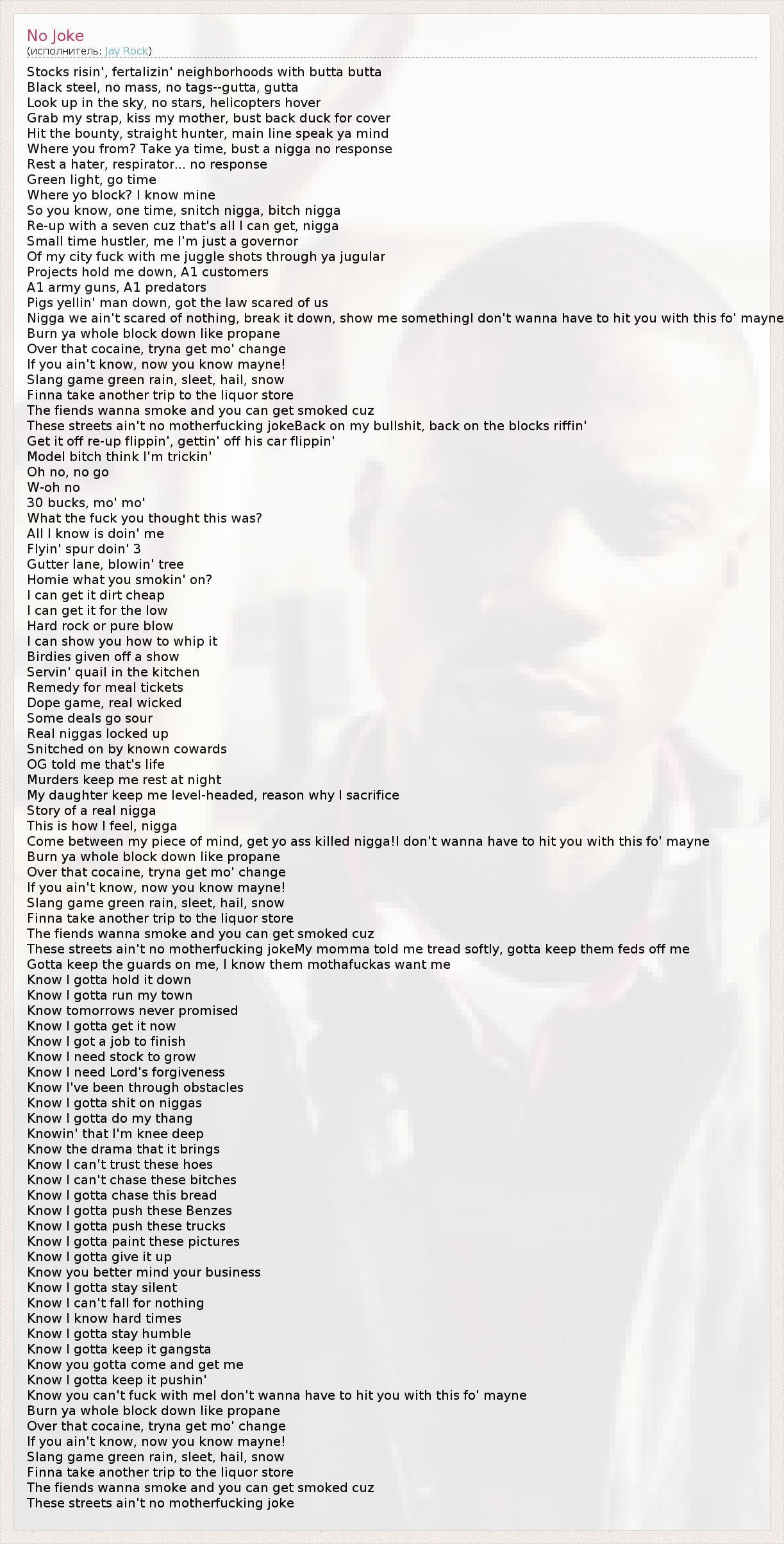 These streets ain't no motherfucking jokeBack on my bullshit, back on the blocks riffin'