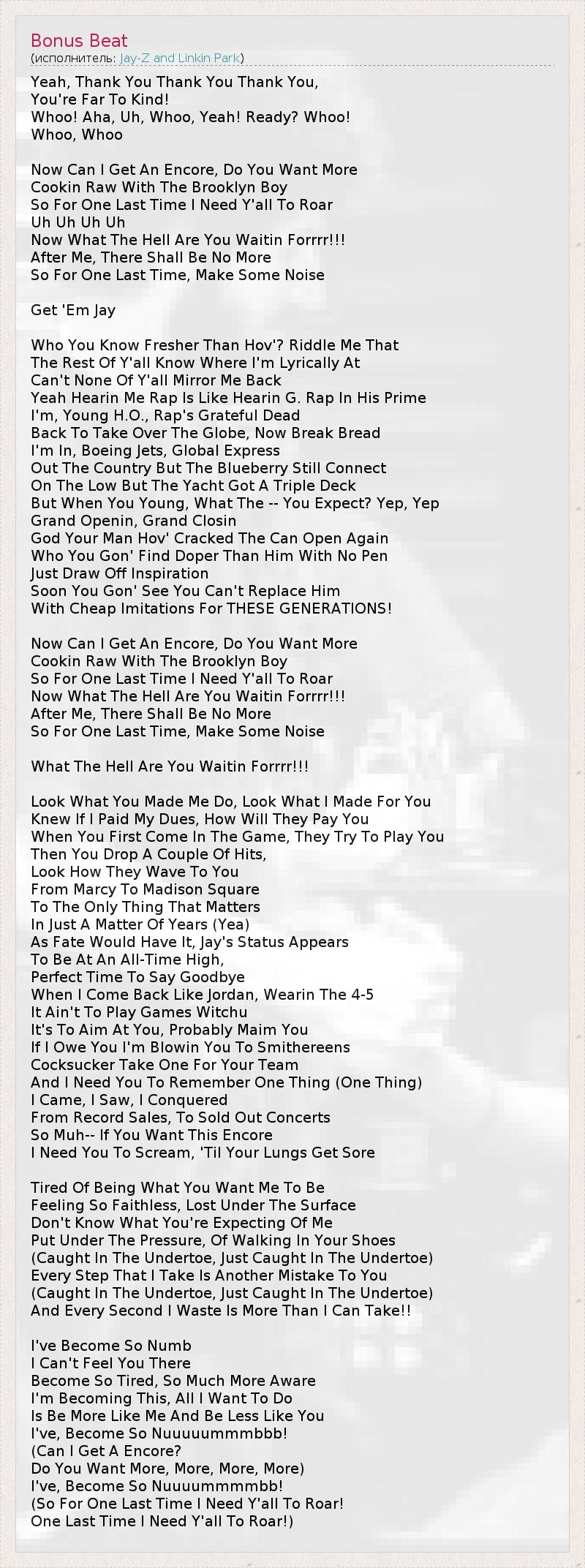 Это интересно:Mash-Up проект и улетная смесь жанров - это дуэт мультиплатинового рэппера Jay-Z и великих ребят из группы Linkin Park, под названием Collision Course Collision Course это набор релизов, который вышел в свет 30 ноября 2004 года на CD/DVD. На компакт-диске 6 трэков, каждый представляет собой сочетание 2-х песен от каждого исполнителя. DVD содержит некоторые закадровые видео о... продолжение