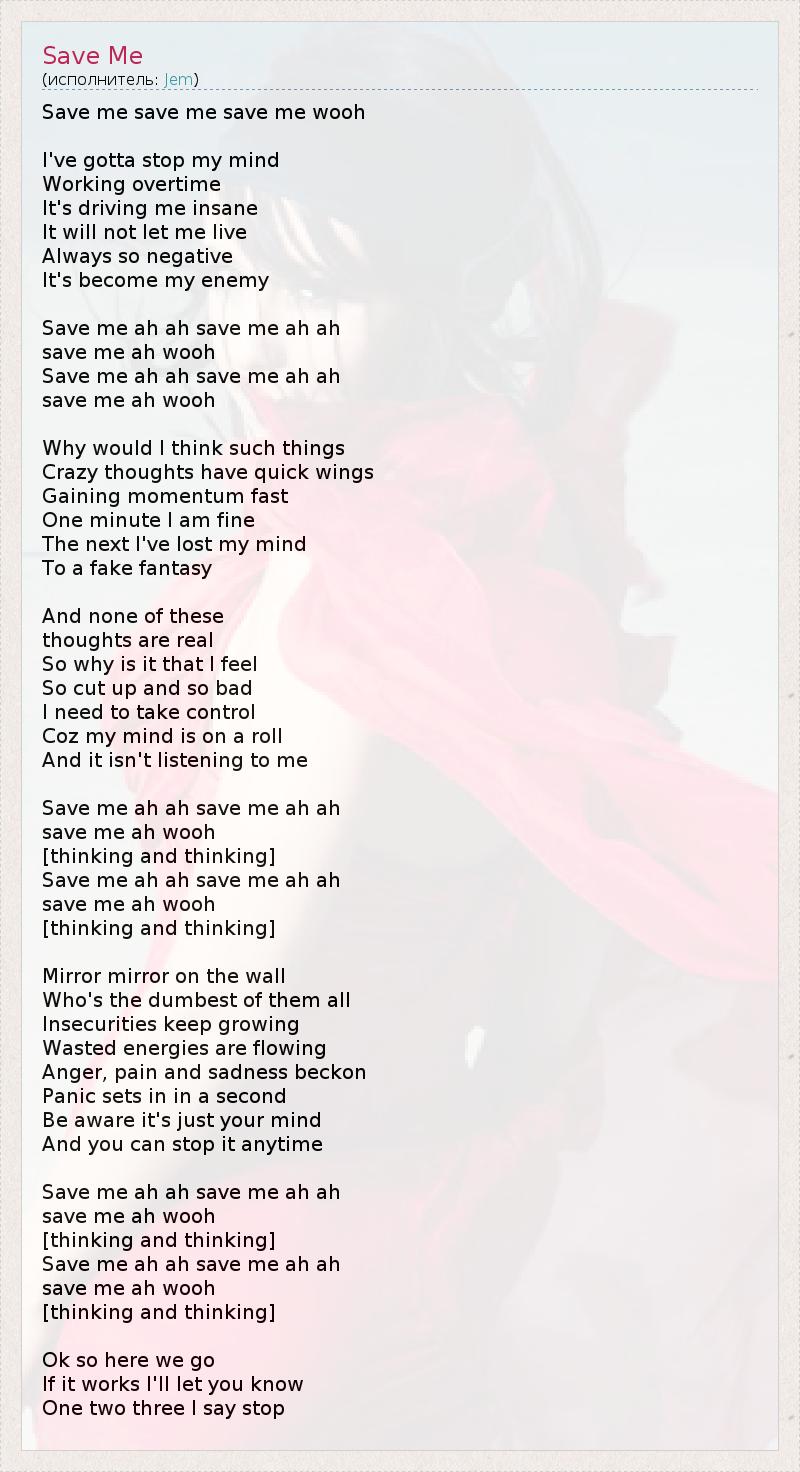 Спаси меня, спаси меня, спаси меня. Я должна прекратить Делать сверхурочную работу, Она сводит меня с ума, Она не дает мне жить, Всегда такая отрицательная, Она стала моим врагом. Спаси меня, спаси меня, Спаси меня. Спаси меня, спаси меня, Спаси меня... Почему я думаю о таких вещах? У безумные мыслей - быстрые крылья, Быстро набираю обороты: Одна минута и я горю, Потом схожу с ума От поддельных фантазий. И ни одна из этих Мыслей не реальна, Так почему я так себя чувствую? Там впереди и все плохо Мне нужно взять себя в руки, Потому что все мои мысли спутались И ни одна не слушается меня. Спаси меня, спаси меня, Спаси меня, Спаси меня, спаси меня, Спаси меня. Зеркало, зеркало на стене, Кто самый тупой на свете? Растет неуверенность, Плохая энергия течет, Гнев, боль и манящая грусть, Несколько паник в секунду - Помни, это всего лишь твои мысли, И ты можешь остановиться в любой момент. Спаси меня, спаси меня, Спаси меня, Спаси меня, спаси меня Спаси меня. Хорошо, мы начинаем! Если это сработает, я дам тебе знать. Раз, два, три, я говорю: "Стоп".