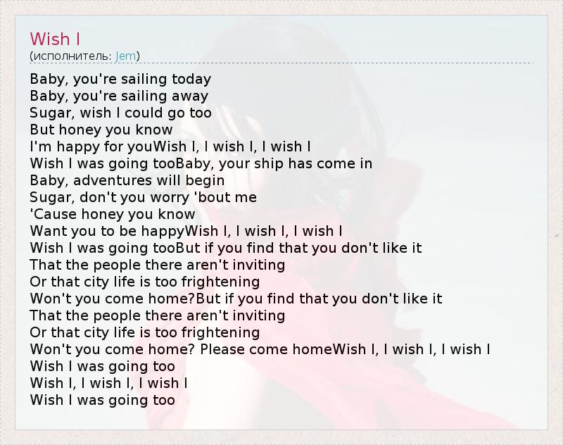 Baby, you're sailing today Baby, you're sailing away Sugar, wish I could go too But honey you know I'm happy for youWish I, I wish I, I wish I Wish I was going tooBaby, your ship has come in Baby, adventures will begin Sugar, don't you worry 'bout me 'Cause honey you know Want you to be happyWish I, I wish I, I wish I Wish I was going tooBut if you find that you don't like it That the people there aren't inviting Or that city life is too frightening Won't you come home?But if you find that you don't like it That the people there aren't inviting Or that city life is too frightening Won't you come home? Please come homeWish I, I wish I, I wish I Wish I was going too Wish I, I wish I, I wish I Wish I was going too