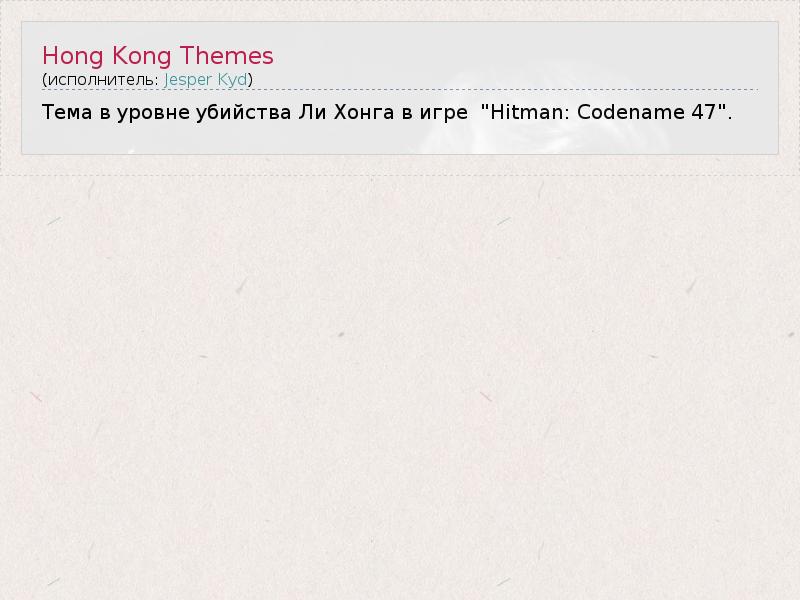 Тема в уровне убийства Ли Хонга в игре  "Hitman: Codename 47".