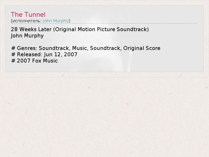28 Weeks Later (Original Motion Picture Soundtrack) John Murphy # Genres: Soundtrack, Music, Soundtrack, Original Score # Released: Jun 12, 2007 # 2007 Fox Music