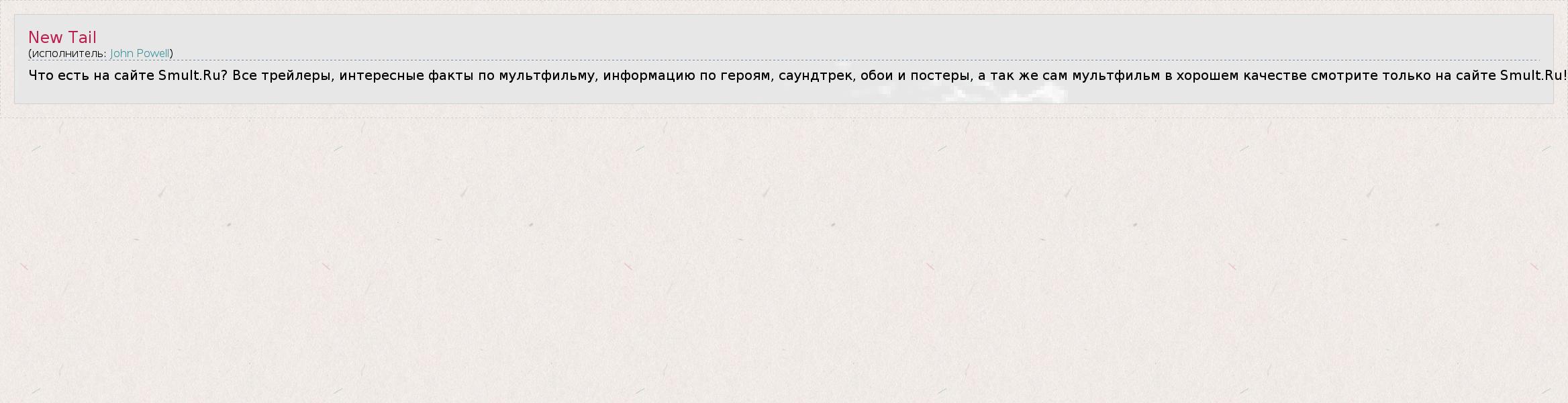 Что есть на сайте Smult.Ru? Все трейлеры, интересные факты по мультфильму, информацию по героям, саундтрек, обои и постеры, а так же сам мультфильм в хорошем качестве смотрите только на сайте Smult.Ru!