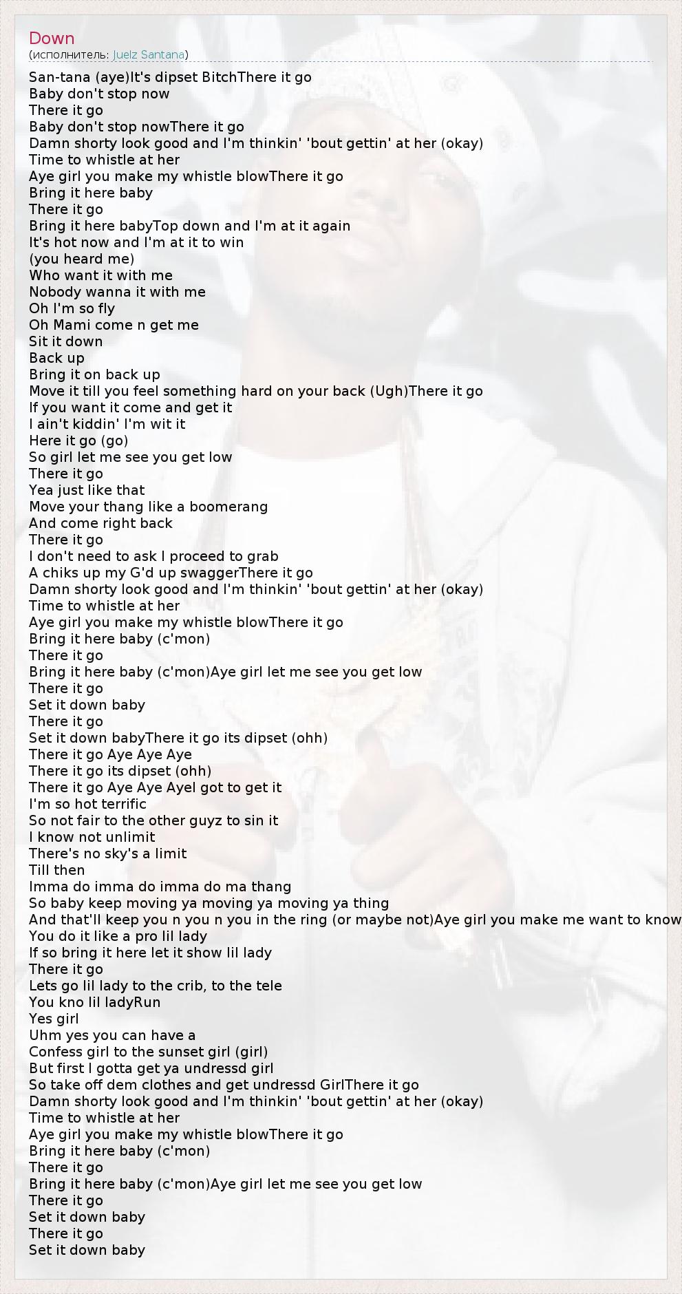 San-tana (aye)It's dipset BitchThere it go Baby don't stop now There it go Baby don't stop nowThere it go Damn shorty look good and I'm thinkin' 'bout gettin' at her (okay) Time to whistle at her Aye girl you make my whistle blowThere it go Bring it here baby There it go Bring it here babyTop down and I'm at it again It's hot now and I'm at it to win (you heard me) Who want it with me Nobody wanna it with me Oh I'm so fly Oh Mami come n get me Sit it down Back up Bring it on back up Move it till you feel something hard on your back (Ugh)There it go If you want it come and get it I ain't kiddin' I'm wit it Here it go (go) So girl let me see you get low There it go Yea just like that Move your thang like a boomerang And come right back There it go I don't need to ask I proceed to grab A chiks up my G'd up swaggerThere it go Damn shorty look good and I'm thinkin' 'bout gettin' at her (okay) Time to whistle at her Aye girl you make my whistle blowThere it go Bring it here baby (c'mon) There it go Bring it here baby (c'mon)Aye girl let me see you get low There it go Set it down baby There it go Set it down babyThere it go its dipset (ohh) There it go Aye Aye Aye There it go its dipset (ohh) There it go Aye Aye AyeI got to get it I'm so hot terrific So not fair to the other guyz to sin it I know not unlimit There's no sky's a limit Till then Imma do imma do imma do ma thang So baby keep moving ya moving ya moving ya thing And that'll keep you n you n you in the ring (or maybe not)Aye girl you make me want to know You do it like a pro lil lady If so bring it here let it show lil lady There it go Lets go lil lady to the crib, to the tele You kno lil ladyRun Yes girl Uhm yes you can have a Confess girl to the sunset girl (girl) But first I gotta get ya undressd girl So take off dem clothes and get undressd GirlThere it go Damn shorty look good and I'm thinkin' 'bout gettin' at her (okay) Time to whistle at her Aye girl you make my whistle blowThere it go Bring it here baby (c'mon) There it go Bring it here baby (c'mon)Aye girl let me see you get low There it go Set it down baby There it go Set it down baby