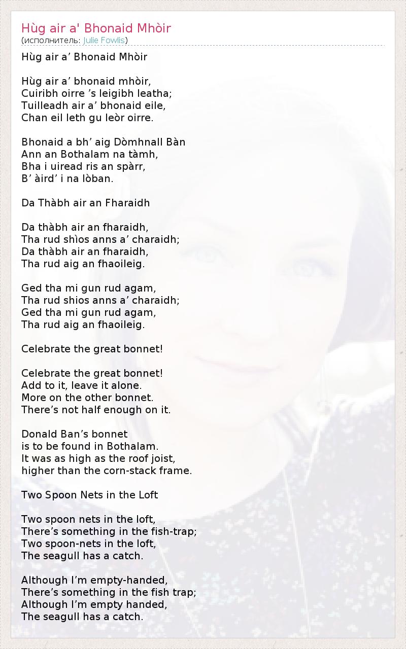ГлавнаяИсполнителиJulie FowlisHùg air a' Bhonaid Mhòir