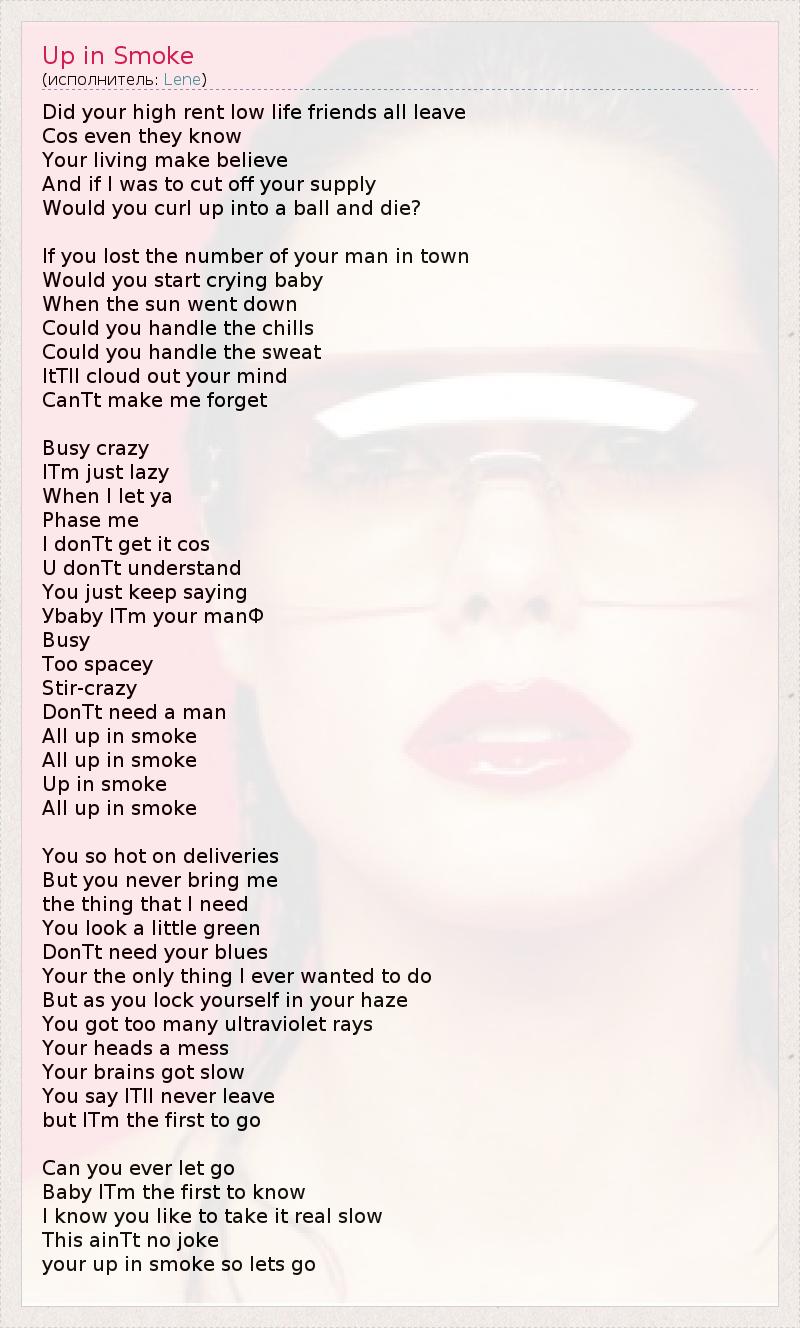Did your high rent low life friends all leave Cos even they know Your living make believe And if I was to cut off your supply Would you curl up into a ball and die? If you lost the number of your man in town Would you start crying baby When the sun went down Could you handle the chills Could you handle the sweat ItТll cloud out your mind CanТt make me forget Busy crazy IТm just lazy When I let ya Phase me I donТt get it cos U donТt understand You just keep saying Уbaby IТm your manФ Busy Too spacey Stir-crazy DonТt need a man All up in smoke All up in smoke Up in smoke All up in smoke You so hot on deliveries But you never bring me the thing that I need You look a little green DonТt need your blues Your the only thing I ever wanted to do But as you lock yourself in your haze You got too many ultraviolet rays Your heads a mess Your brains got slow You say IТll never leave but IТm the first to go Can you ever let go Baby IТm the first to know I know you like to take it real slow This ainТt no joke your up in smoke so lets go
