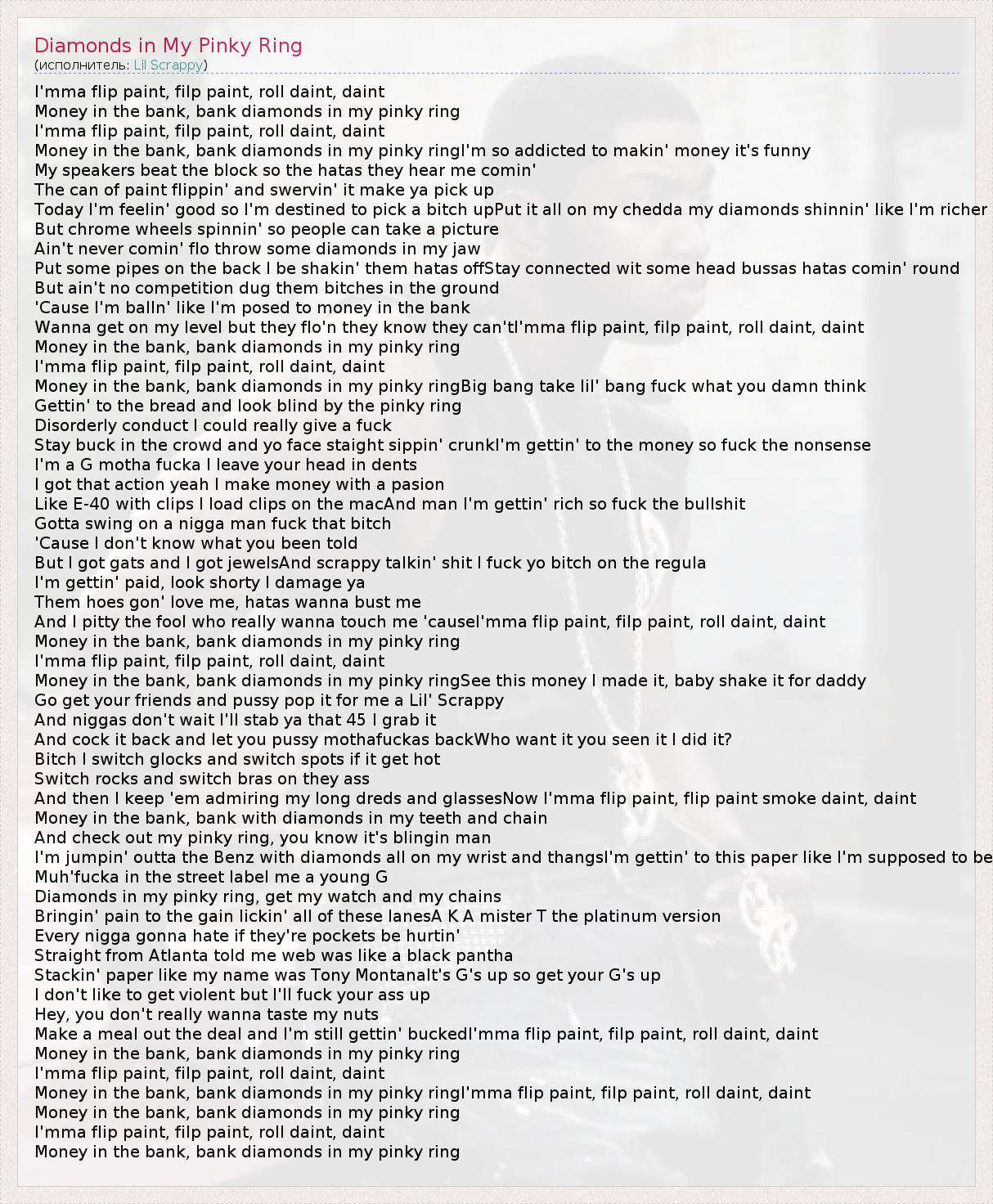 А как ты думаешь, о чем песня "Diamonds in My Pinky Ring" ?