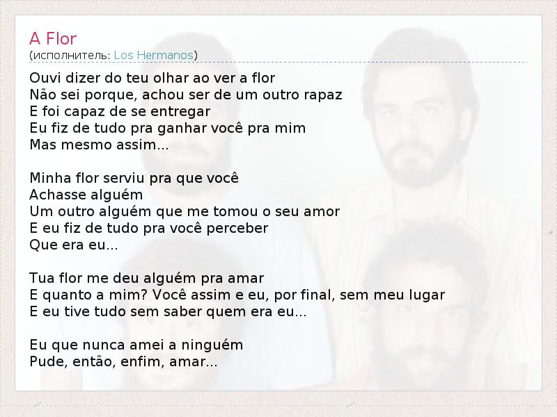 Это интересно:Los Hermanos - поп-рок группа из Rio de Janeiro, Brazil. Образовались в 1997 в составе Marcelo Camelo (вокал/гитара), Rodrigo Amarante (флейта/гитара/вокал), Rodrigo Barba (ударные), and Bruno Medina (клавишные). С апреля 2007 группа находится в творческом скажем так отпуске.Начав в 1999 году с хардкора, парни плавно перешли к сделавшей их знаменитой смеси рока с бразильскими ритмами, такими как самба, chorinho и боссанова.Their most recent record,... продолжение