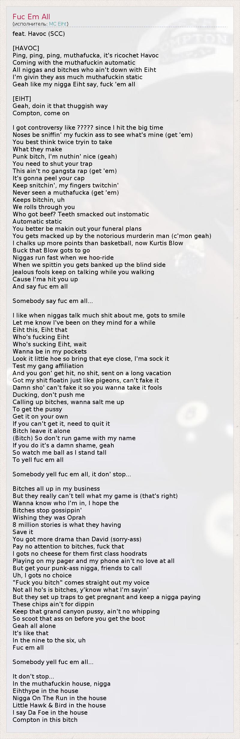 feat. Havoc (SCC) [HAVOC] Ping, ping, ping, muthafucka, it's ricochet Havoc Coming with the muthafuckin automatic All niggas and bitches who ain't down with Eiht I'm givin they ass much muthafuckin static Geah like my nigga Eiht say, fuck 'em all [EIHT] Geah, doin it that thuggish way Compton, come on I got controversy like ????? since I hit the big time Noses be sniffin' my fuckin ass to see what's mine (get 'em) You best think twice tryin to take What they make Punk bitch, I'm nuthin' nice (geah) You need to shut your trap This ain't no gangsta rap (get 'em) It's gonna peel your cap Keep snitchin', my fingers twitchin' Never seen a muthafucka (get 'em) Keeps bitchin, uh We rolls through you Who got beef? Teeth smacked out instomatic Automatic static You better be makin out your funeral plans You gets macked up by the notorious murderin man (c'mon geah) I chalks up more points than basketball, now Kurtis Blow Buck that Blow gots to go Niggas run fast when we hoo-ride When we spittin you gets banked up the blind side Jealous fools keep on talking while you walking Cause I'ma hit you up And say fuc em all Somebody say fuc em all... I like when niggas talk much shit about me, gots to smile Let me know I've been on they mind for a while Eiht this, Eiht that Who's fucking Eiht Who's sucking Eiht, wait Wanna be in my pockets Look it little hoe so bring that eye close, I'ma sock it Test my gang affiliation And you gon' get hit, no shit, sent on a long vacation Got my shit floatin just like pigeons, can't fake it Damn sho' can't fake it so you wanna take it fools Ducking, don't push me Calling up bitches, wanna salt me up To get the pussy Get it on your own If you can't get it, need to quit it Bitch leave it alone (Bitch) So don't run game with my name If you do it's a damn shame, geah So watch me ball as I stand tall To yell fuc em all Somebody yell fuc em all, it don' stop... Bitches all up in my business But they really can't tell what my game is (that's right) Wanna know who I'm in, I hope the Bitches stop gossippin' Wishing they was Oprah 8 million stories is what they having Save it You got more drama than David (sorry-ass) Pay no attention to bitches, fuck that I gots no cheese for them first class hoodrats Playing on my pager and my phone ain't no love at all But get your punk-ass nigga, friends to call Uh, I gots no choice "Fuck you bitch" comes straight out my voice Not all ho's is bitches, y'know what I'm sayin' But they set up traps to get pregnant and keep a nigga paying These chips ain't for dippin Keep that grand canyon pussy, ain't no whipping So scoot that ass on before you get the boot Geah all alone It's like that In the nine to the six, uh Fuc em all Somebody yell fuc em all... It don't stop... In the muthafuckin house, nigga Eihthype in the house Nigga On The Run in the house Little Hawk & Bird in the house I say Da Foe in the house Compton in this bitch