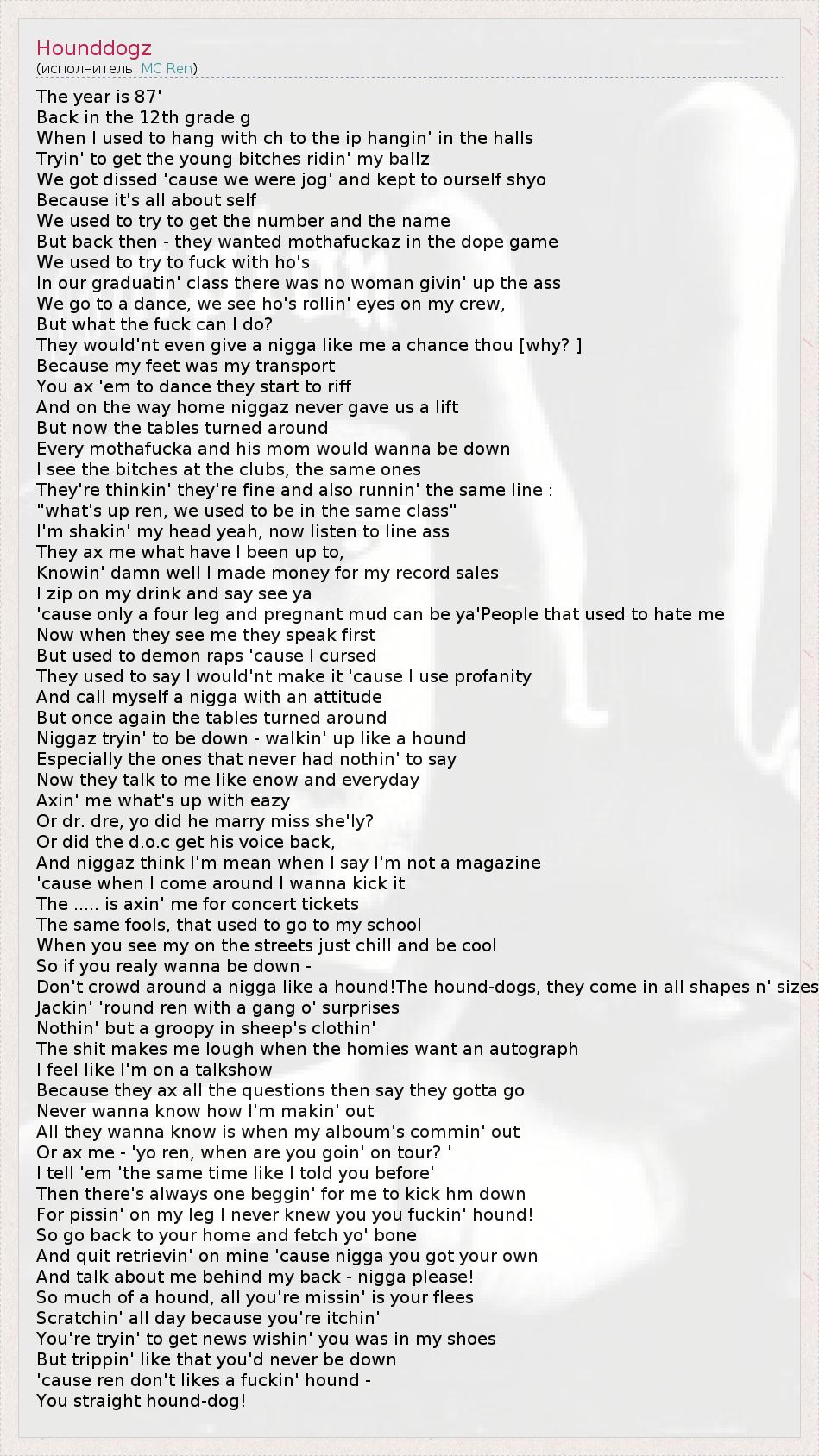 The year is 87' Back in the 12th grade g When I used to hang with ch to the ip hangin' in the halls Tryin' to get the young bitches ridin' my ballz We got dissed 'cause we were jog' and kept to ourself shyo Because it's all about self We used to try to get the number and the name But back then - they wanted mothafuckaz in the dope game We used to try to fuck with ho's In our graduatin' class there was no woman givin' up the ass We go to a dance, we see ho's rollin' eyes on my crew, But what the fuck can I do? They would'nt even give a nigga like me a chance thou [why? ] Because my feet was my transport You ax 'em to dance they start to riff And on the way home niggaz never gave us a lift But now the tables turned around Every mothafucka and his mom would wanna be down I see the bitches at the clubs, the same ones They're thinkin' they're fine and also runnin' the same line : "what's up ren, we used to be in the same class" I'm shakin' my head yeah, now listen to line ass They ax me what have I been up to, Knowin' damn well I made money for my record sales I zip on my drink and say see ya 'cause only a four leg and pregnant mud can be ya'People that used to hate me Now when they see me they speak first But used to demon raps 'cause I cursed They used to say I would'nt make it 'cause I use profanity And call myself a nigga with an attitude But once again the tables turned around Niggaz tryin' to be down - walkin' up like a hound Especially the ones that never had nothin' to say Now they talk to me like enow and everyday Axin' me what's up with eazy Or dr. dre, yo did he marry miss she'ly? Or did the d.o.c get his voice back, And niggaz think I'm mean when I say I'm not a magazine 'cause when I come around I wanna kick it The ..... is axin' me for concert tickets The same fools, that used to go to my school When you see my on the streets just chill and be cool So if you realy wanna be down - Don't crowd around a nigga like a hound!The hound-dogs, they come in all shapes n' sizes Jackin' 'round ren with a gang o' surprises Nothin' but a groopy in sheep's clothin' The shit makes me lough when the homies want an autograph I feel like I'm on a talkshow Because they ax all the questions then say they gotta go Never wanna know how I'm makin' out All they wanna know is when my alboum's commin' out Or ax me - 'yo ren, when are you goin' on tour? ' I tell 'em 'the same time like I told you before' Then there's always one beggin' for me to kick hm down For pissin' on my leg I never knew you you fuckin' hound! So go back to your home and fetch yo' bone And quit retrievin' on mine 'cause nigga you got your own And talk about me behind my back - nigga please! So much of a hound, all you're missin' is your flees Scratchin' all day because you're itchin' You're tryin' to get news wishin' you was in my shoes But trippin' like that you'd never be down 'cause ren don't likes a fuckin' hound - You straight hound-dog!