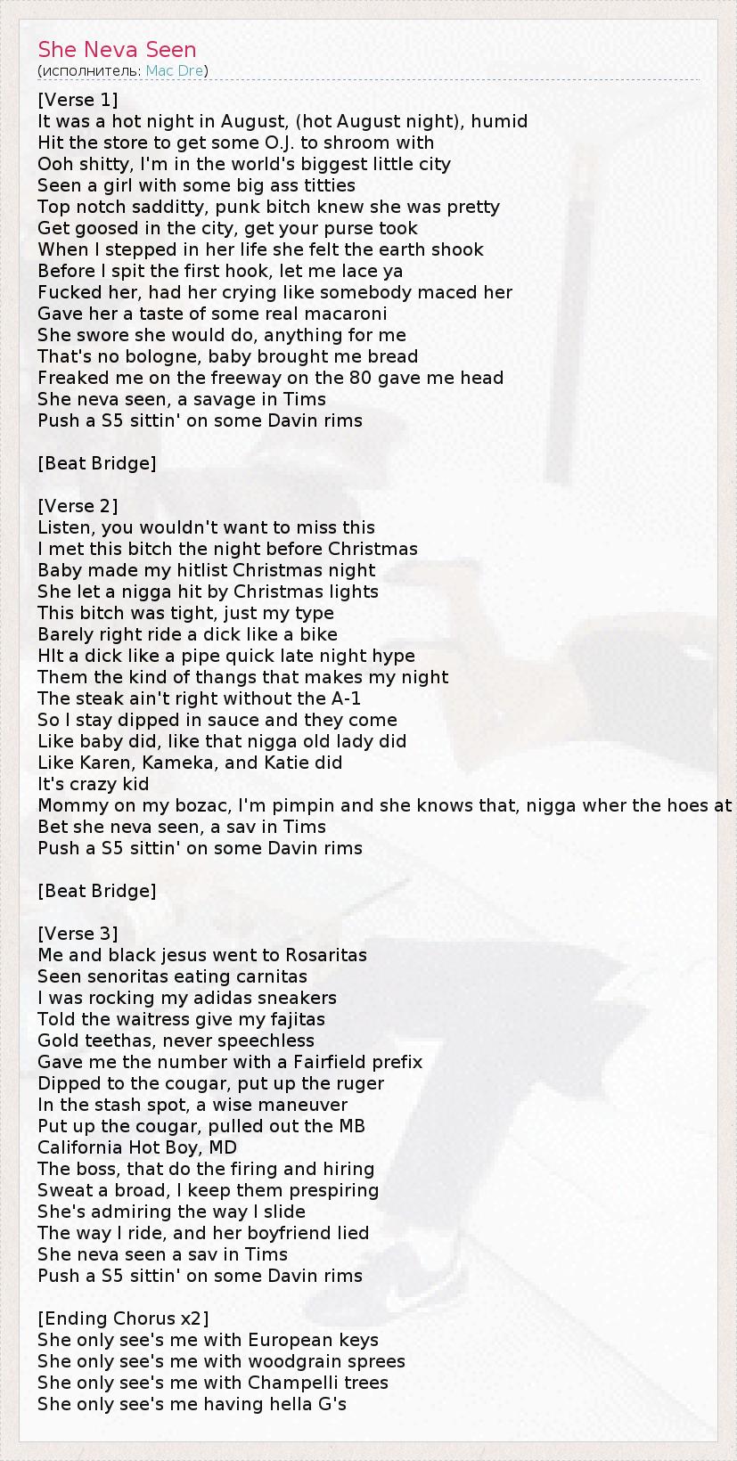 А как ты думаешь, о чем песня "She Neva Seen" ?