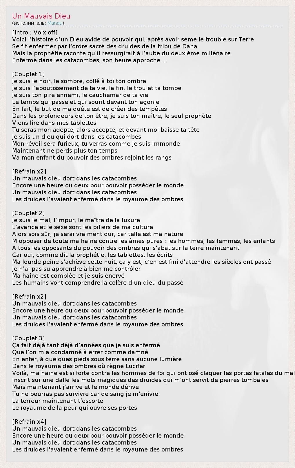 А как ты думаешь, о чем песня "Un Mauvais Dieu" ?
