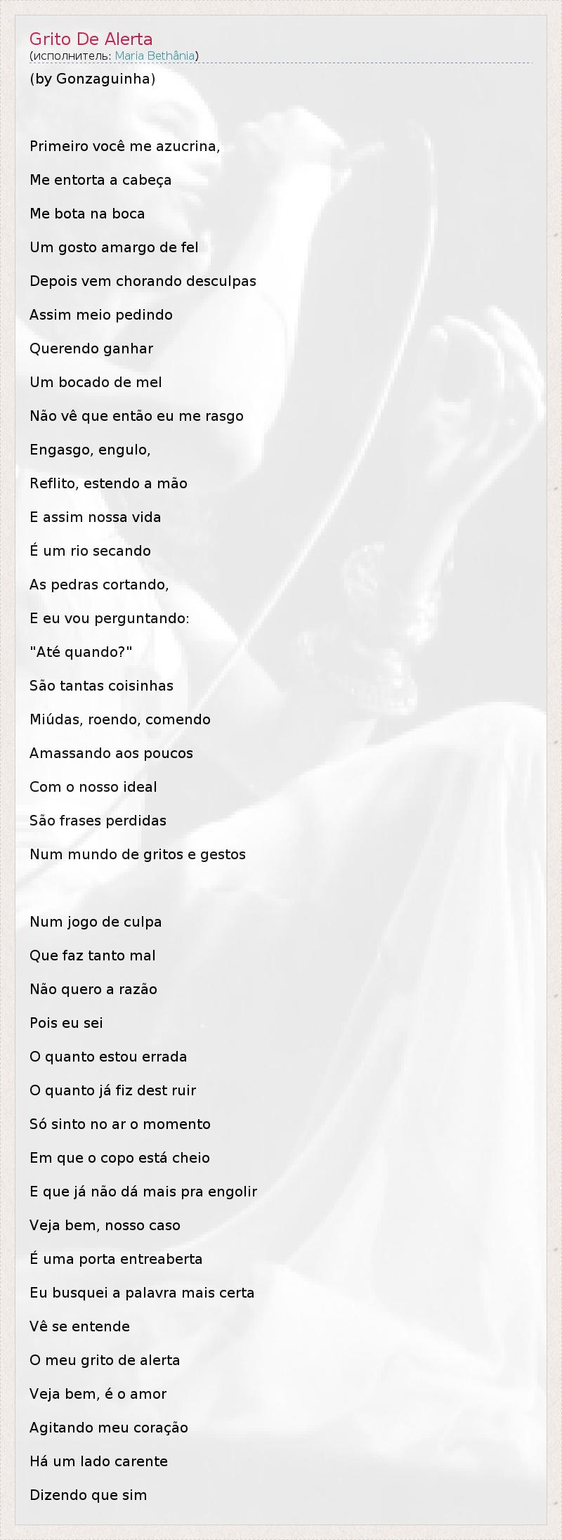 Это интересно:Голос бразильской примы Марии Бетании низкий, почти мужской, очень яркий, сильный, подходит для самых разных жанров от самбы до джаза. В ее обширной дискографии баллады и босса нова, танго и регги, песни в ее исполнении часто используются в сериалах ("Сладкий ручей", "Нежный яд", "Во имя любви" "В мире женщин", "Тихие страсти Мадалены", "Непокорная", "Лабиринт",... продолжение