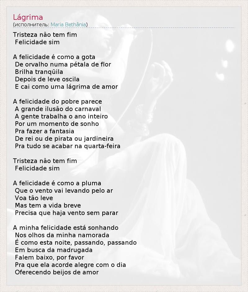 Это интересно:Голос бразильской примы Марии Бетании низкий, почти мужской, очень яркий, сильный, подходит для самых разных жанров от самбы до джаза. В ее обширной дискографии баллады и босса нова, танго и регги, песни в ее исполнении часто используются в сериалах ("Сладкий ручей", "Нежный яд", "Во имя любви" "В мире женщин", "Тихие страсти Мадалены", "Непокорная", "Лабиринт",... продолжение