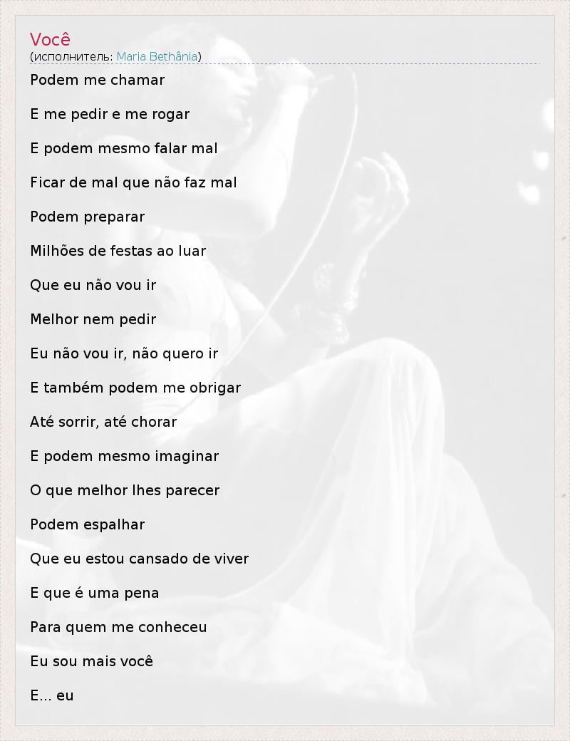 Это интересно:Голос бразильской примы Марии Бетании низкий, почти мужской, очень яркий, сильный, подходит для самых разных жанров от самбы до джаза. В ее обширной дискографии баллады и босса нова, танго и регги, песни в ее исполнении часто используются в сериалах ("Сладкий ручей", "Нежный яд", "Во имя любви" "В мире женщин", "Тихие страсти Мадалены", "Непокорная", "Лабиринт",... продолжение