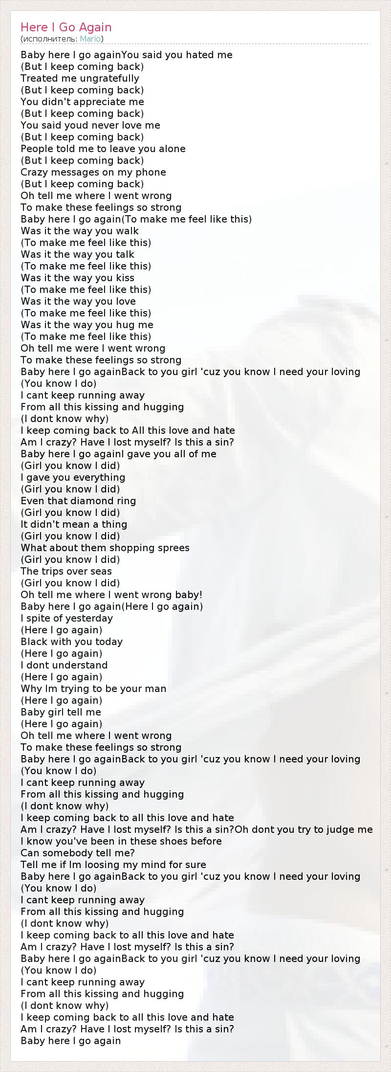 Baby here I go againBack to you girl 'cuz you know I need your loving