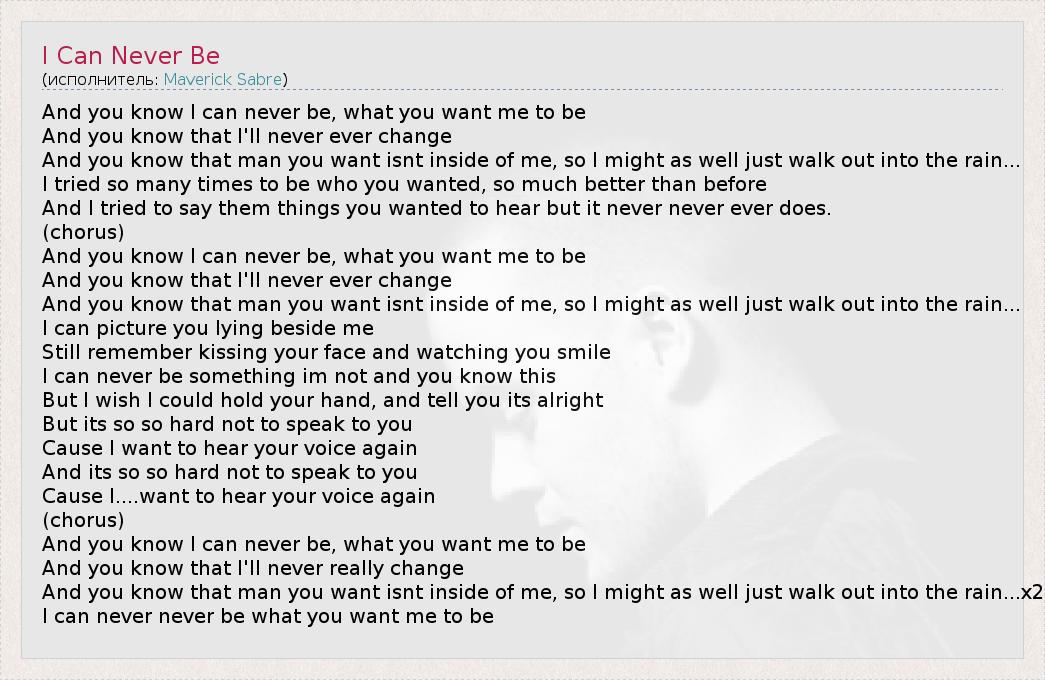 And you know I can never be, what you want me to be And you know that I'll never ever change And you know that man you want isnt inside of me, so I might as well just walk out into the rain... I tried so many times to be who you wanted, so much better than before And I tried to say them things you wanted to hear but it never never ever does. (chorus) And you know I can never be, what you want me to be And you know that I'll never ever change And you know that man you want isnt inside of me, so I might as well just walk out into the rain... I can picture you lying beside me Still remember kissing your face and watching you smile I can never be something im not and you know this But I wish I could hold your hand, and tell you its alright But its so so hard not to speak to you Cause I want to hear your voice again And its so so hard not to speak to you Cause I....want to hear your voice again (chorus) And you know I can never be, what you want me to be And you know that I'll never really change And you know that man you want isnt inside of me, so I might as well just walk out into the rain...x2 I can never never be what you want me to be