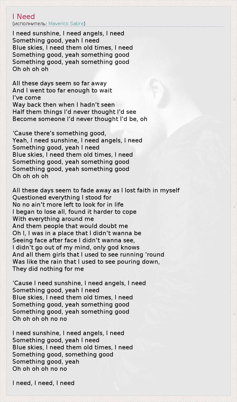 Поэтому я нуждаюсь в солнечном свете, я нуждаюсь в ангелах, я нуждаюсь