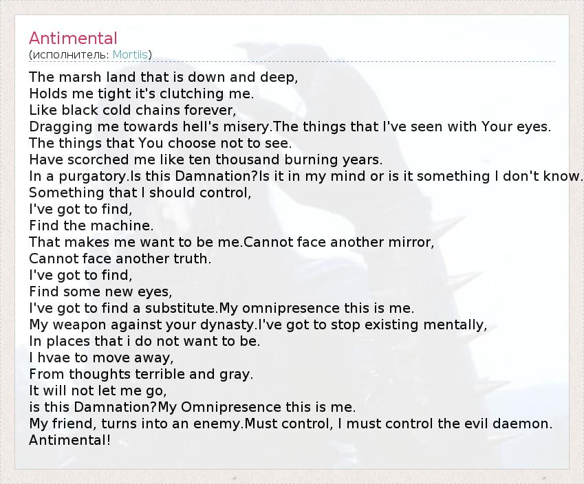 The marsh land that is down and deep, Holds me tight it's clutching me. Like black cold chains forever, Dragging me towards hell's misery.The things that I've seen with Your eyes. The things that You choose not to see. Have scorched me like ten thousand burning years. In a purgatory.Is this Damnation?Is it in my mind or is it something I don't know. Something that I should control, I've got to find, Find the machine. That makes me want to be me.Cannot face another mirror, Cannot face another truth. I've got to find, Find some new eyes, I've got to find a substitute.My omnipresence this is me. My weapon against your dynasty.I've got to stop existing mentally, In places that i do not want to be. I hvae to move away, From thoughts terrible and gray. It will not let me go, is this Damnation?My Omnipresence this is me. My friend, turns into an enemy.Must control, I must control the evil daemon. Antimental!