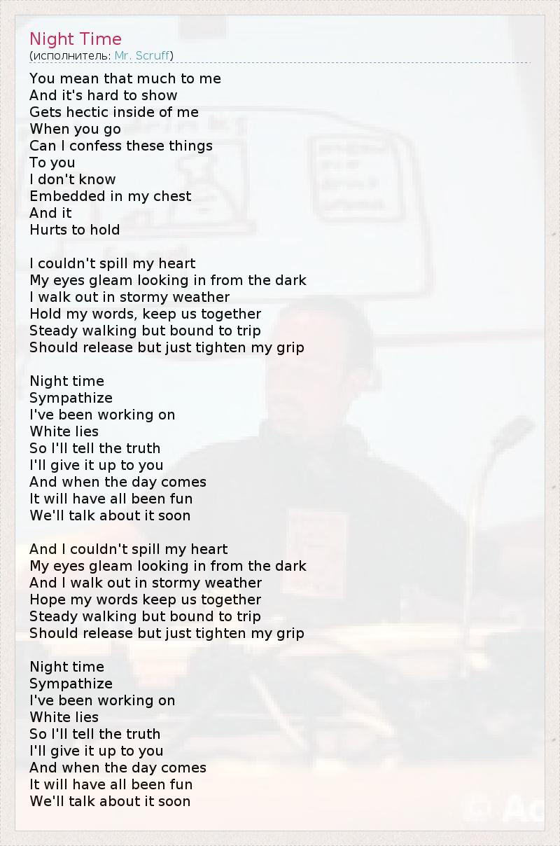 You mean that much to me And it's hard to show Gets hectic inside of me When you go Can I confess these things To you I don't know Embedded in my chest And it Hurts to hold I couldn't spill my heart My eyes gleam looking in from the dark I walk out in stormy weather Hold my words, keep us together Steady walking but bound to trip Should release but just tighten my grip Night time Sympathize I've been working on White lies So I'll tell the truth I'll give it up to you And when the day comes It will have all been fun We'll talk about it soon And I couldn't spill my heart My eyes gleam looking in from the dark And I walk out in stormy weather Hope my words keep us together Steady walking but bound to trip Should release but just tighten my grip Night time Sympathize I've been working on White lies So I'll tell the truth I'll give it up to you And when the day comes It will have all been fun We'll talk about it soon