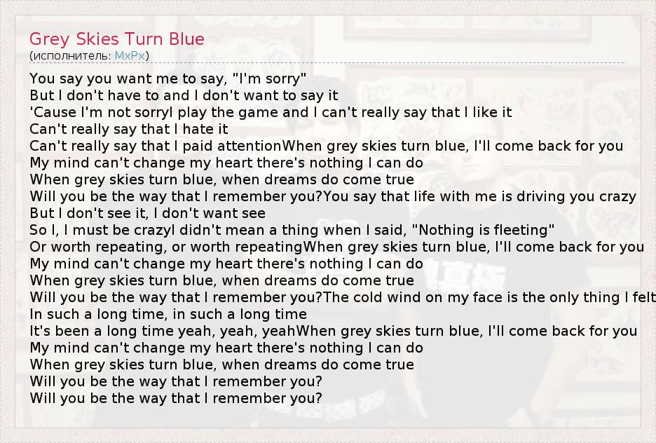 You say you want me to say, "I'm sorry" But I don't have to and I don't want to say it 'Cause I'm not sorryI play the game and I can't really say that I like it Can't really say that I hate it Can't really say that I paid attentionWhen grey skies turn blue, I'll come back for you My mind can't change my heart there's nothing I can do When grey skies turn blue, when dreams do come true Will you be the way that I remember you?You say that life with me is driving you crazy But I don't see it, I don't want see So I, I must be crazyI didn't mean a thing when I said, "Nothing is fleeting" Or worth repeating, or worth repeatingWhen grey skies turn blue, I'll come back for you My mind can't change my heart there's nothing I can do When grey skies turn blue, when dreams do come true Will you be the way that I remember you?The cold wind on my face is the only thing I felt In such a long time, in such a long time It's been a long time yeah, yeah, yeahWhen grey skies turn blue, I'll come back for you My mind can't change my heart there's nothing I can do When grey skies turn blue, when dreams do come true Will you be the way that I remember you? Will you be the way that I remember you?