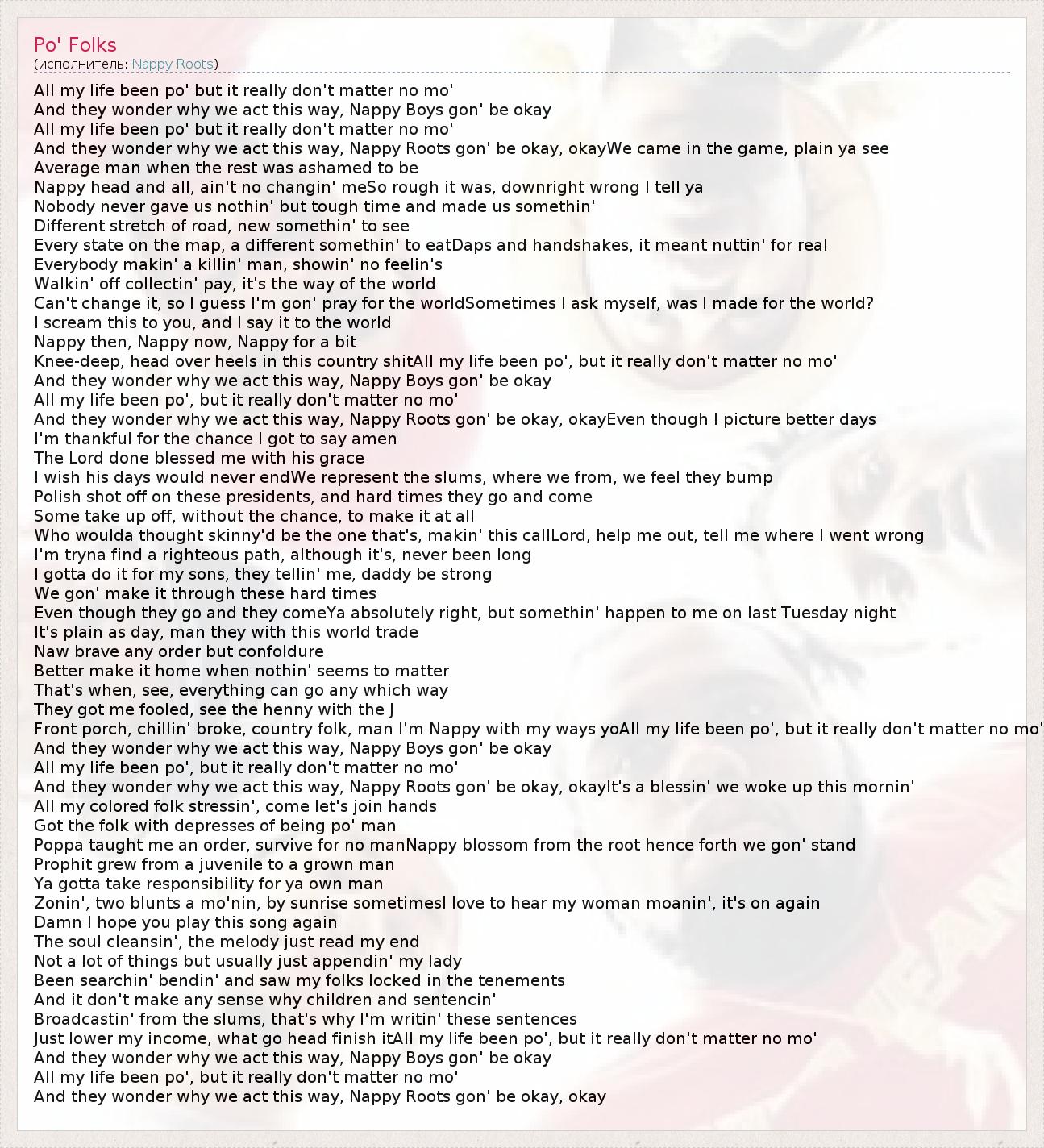 А как ты думаешь, о чем песня "Po' Folks" ?