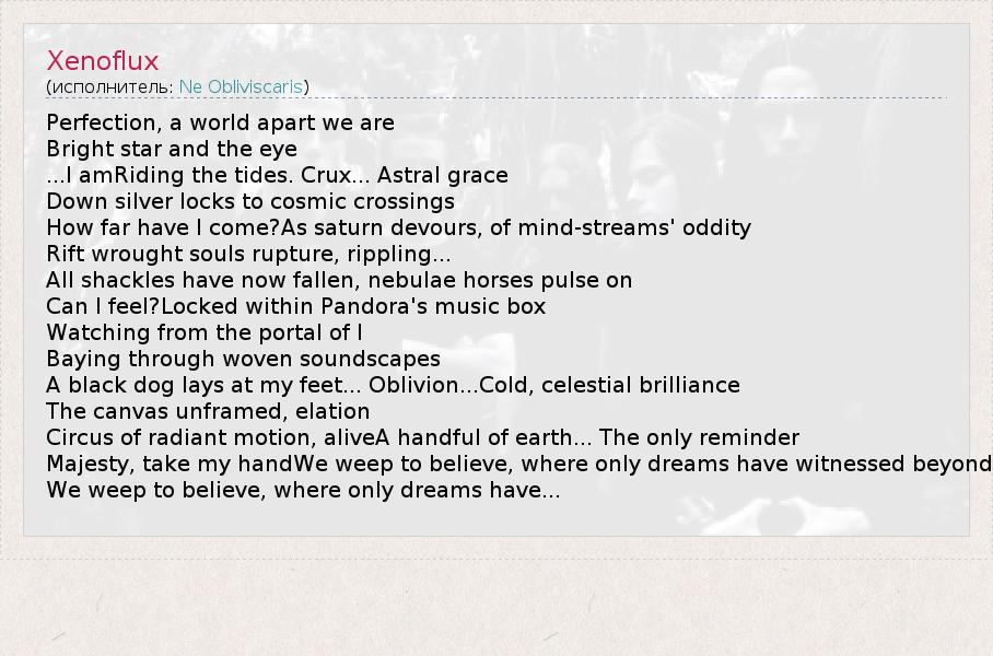 Это интересно:В 2003 году в городе Мельбурне шестеро талантливых музыкантов решили создать свою музыкальную формацию под названием Ne Obliviscaris (от лат. - "долг памяти"). В первый состав вошли Xenoyr (экстрим-вокал), Тим Чарльз (скрипка), Адам Купер (бас-гитара), Кори Бейкер (ударные), Адам Бобби (гитара), Шери-Джесс (женский вокал).В 2004 из команды ушли вокалистка Шери-Джесс, басист Адам Купер, гитарист Адам... продолжение
