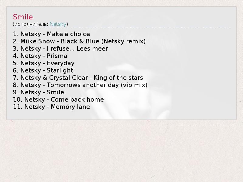 Это интересно:Boris Daenen - он же Netsky - бельгийский продюсер, в буквальном смысле взорвавший Drum & Bass сцену в 2009 году. Родился 22 марта 1989 года в городке Edegem (провинция Аntwerpen, Бельгия). Псевдоним Netsky связан с компьютерным вирусом. Музыка Netsky - это музыка в стиле Liquid Funk - Drum & Bass. Многослойность мелодий, ритмичный бит, легкая усвояемость... продолжение