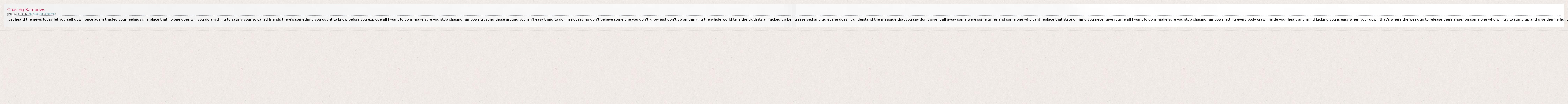 Just heard the news today let yourself down once again trusted your feelings in a place that no one goes will you do anything to satisfy your so called friends there's something you ought to know before you explode all I want to do is make sure you stop chasing rainbows trusting those around you isn't easy thing to do I'm not saying don't believe some one you don't know just don't go on thinking the whole world tells the truth its all fucked up being reserved and quiet she doesn't understand the message that you say don't give it all away some were some times and some one who cant replace that state of mind you never give it time all I want to do is make sure you stop chasing rainbows letting every body crawl inside your heart and mind kicking you is easy when your down that's where the week go to release there anger on some one who will try to stand up and give them a fight