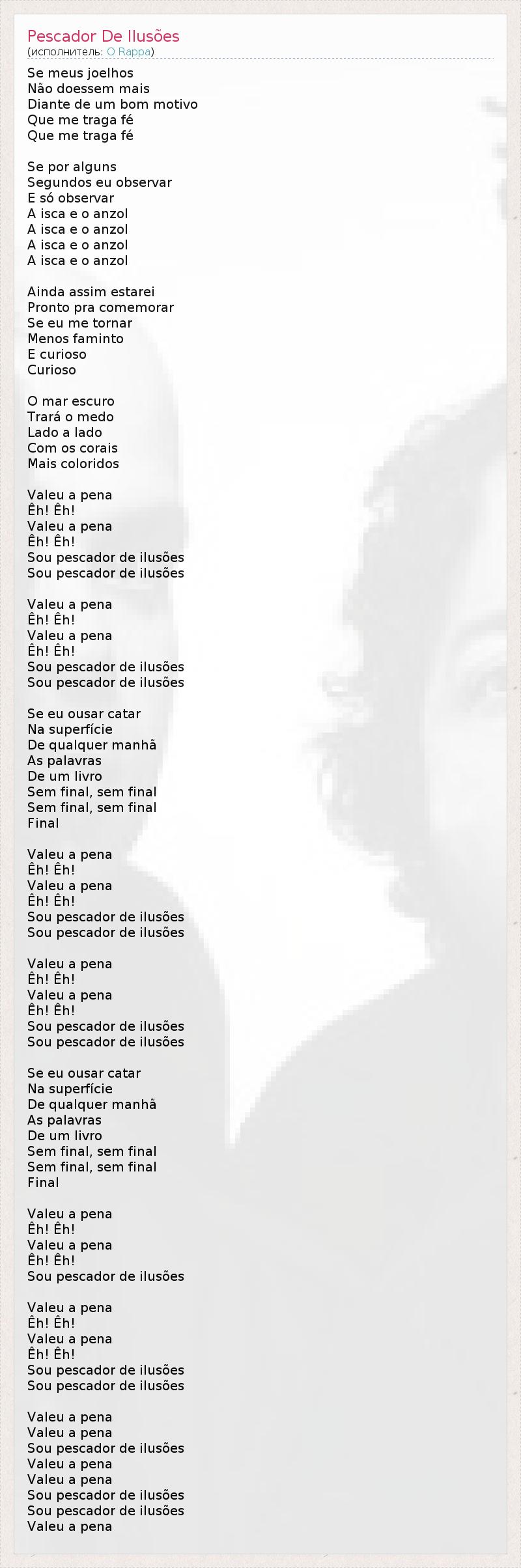 Se meus joelhos Não doessem mais Diante de um bom motivo Que me traga fé Que me traga fé Se por alguns Segundos eu observar E só observar A isca e o anzol A isca e o anzol A isca e o anzol A isca e o anzol Ainda assim estarei Pronto pra comemorar Se eu me tornar Menos faminto E curioso Curioso O mar escuro Trará o medo Lado a lado Com os corais Mais coloridos Valeu a pena Êh! Êh! Valeu a pena Êh! Êh! Sou pescador de ilusões Sou pescador de ilusões Valeu a pena Êh! Êh! Valeu a pena Êh! Êh! Sou pescador de ilusões Sou pescador de ilusões Se eu ousar catar Na superfície De qualquer manhã As palavras De um livro Sem final, sem final Sem final, sem final Final Valeu a pena Êh! Êh! Valeu a pena Êh! Êh! Sou pescador de ilusões Sou pescador de ilusões Valeu a pena Êh! Êh! Valeu a pena Êh! Êh! Sou pescador de ilusões Sou pescador de ilusões Se eu ousar catar Na superfície De qualquer manhã As palavras De um livro Sem final, sem final Sem final, sem final Final Valeu a pena Êh! Êh! Valeu a pena Êh! Êh! Sou pescador de ilusões Valeu a pena Êh! Êh! Valeu a pena Êh! Êh! Sou pescador de ilusões Sou pescador de ilusões Valeu a pena Valeu a pena Sou pescador de ilusões Valeu a pena Valeu a pena Sou pescador de ilusões Sou pescador de ilusões Valeu a pena