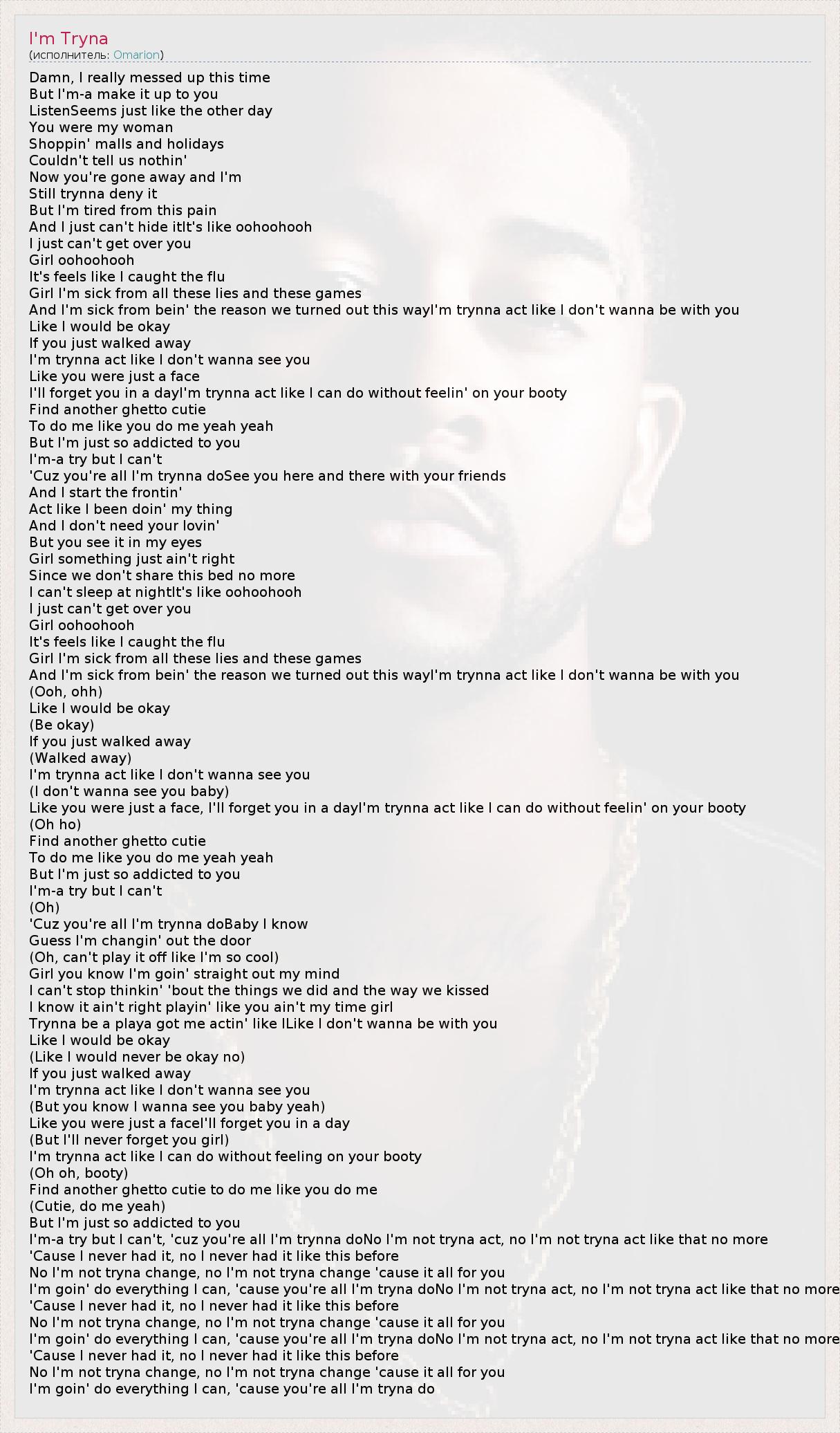 I'm-a try but I can't, 'cuz you're all I'm trynna doNo I'm not tryna act, no I'm not tryna act like that no more