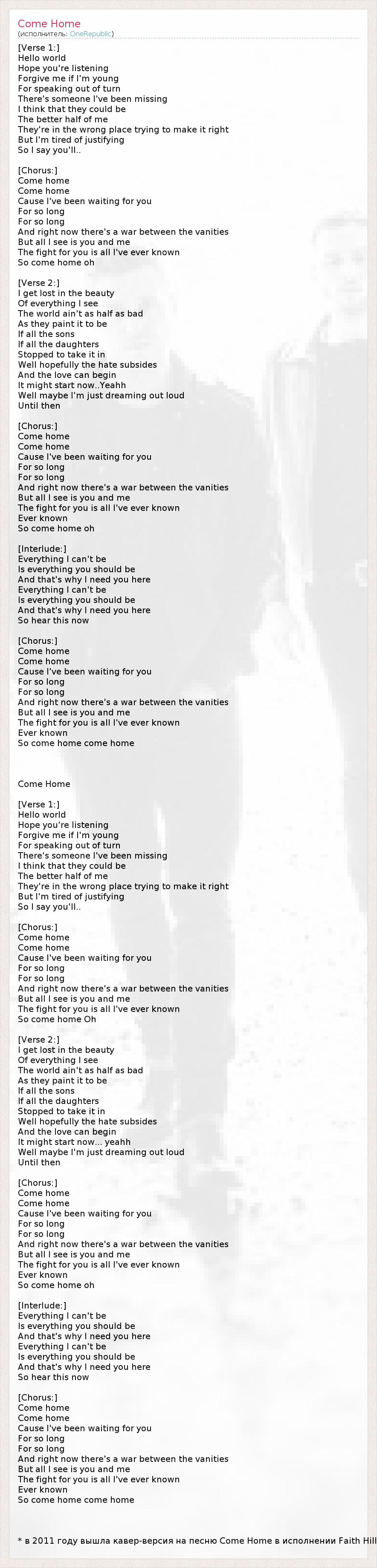 * в 2011 году вышла кавер-версия на песню Come Home в исполнении Faith Hill