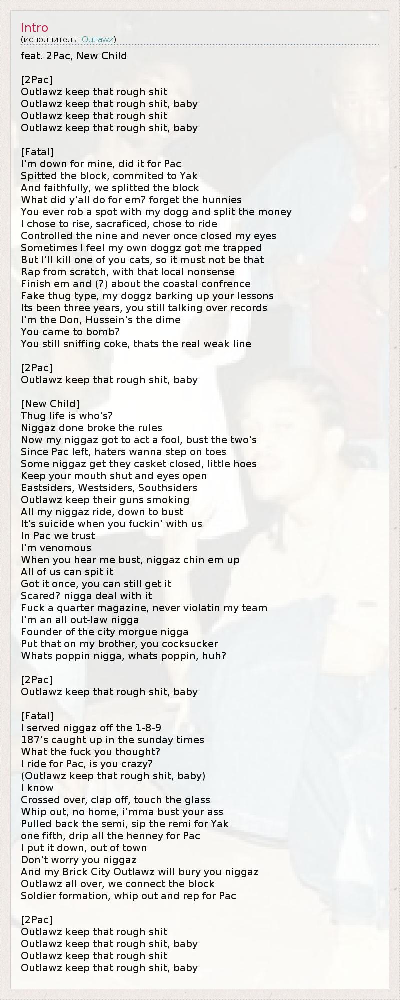 Это интересно:Группа Outlawz (“Беззаконники”) была создана под покровительством Тупака Шакура. Впервые некоторые будущие участники Outlawz появились в саундтрэке к фильму “Above the Rim”, как группа Thug Life. Тогда она состояла из: Macodoshis, The Rated R, Big Syke, и Mopreme. Последний, к слову, являлся Тупаку сводным братом. Впоследствии только он и Большой Сайк присоединились к Outlawz Immortalz. Затем, в третьем сольном... продолжение