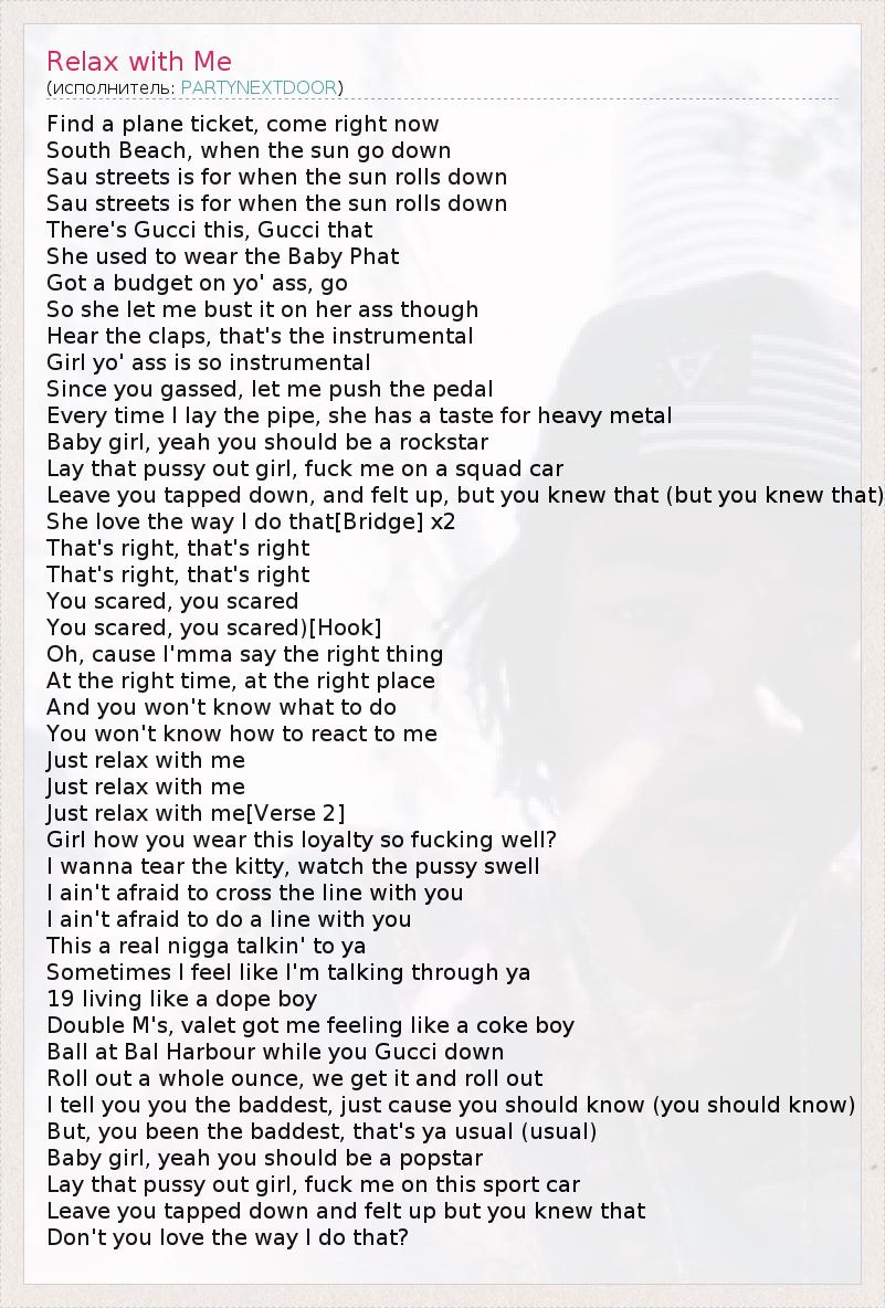 Find a plane ticket, come right now South Beach, when the sun go down Sau streets is for when the sun rolls down Sau streets is for when the sun rolls down There's Gucci this, Gucci that She used to wear the Baby Phat Got a budget on yo' ass, go So she let me bust it on her ass though Hear the claps, that's the instrumental Girl yo' ass is so instrumental Since you gassed, let me push the pedal Every time I lay the pipe, she has a taste for heavy metal Baby girl, yeah you should be a rockstar Lay that pussy out girl, fuck me on a squad car Leave you tapped down, and felt up, but you knew that (but you knew that) She love the way I do that[Bridge] x2 That's right, that's right That's right, that's right You scared, you scared You scared, you scared)[Hook] Oh, cause I'mma say the right thing At the right time, at the right place And you won't know what to do You won't know how to react to me Just relax with me Just relax with me Just relax with me[Verse 2] Girl how you wear this loyalty so fucking well? I wanna tear the kitty, watch the pussy swell I ain't afraid to cross the line with you I ain't afraid to do a line with you This a real nigga talkin' to ya Sometimes I feel like I'm talking through ya 19 living like a dope boy Double M's, valet got me feeling like a coke boy Ball at Bal Harbour while you Gucci down Roll out a whole ounce, we get it and roll out I tell you you the baddest, just cause you should know (you should know) But, you been the baddest, that's ya usual (usual) Baby girl, yeah you should be a popstar Lay that pussy out girl, fuck me on this sport car Leave you tapped down and felt up but you knew that Don't you love the way I do that?