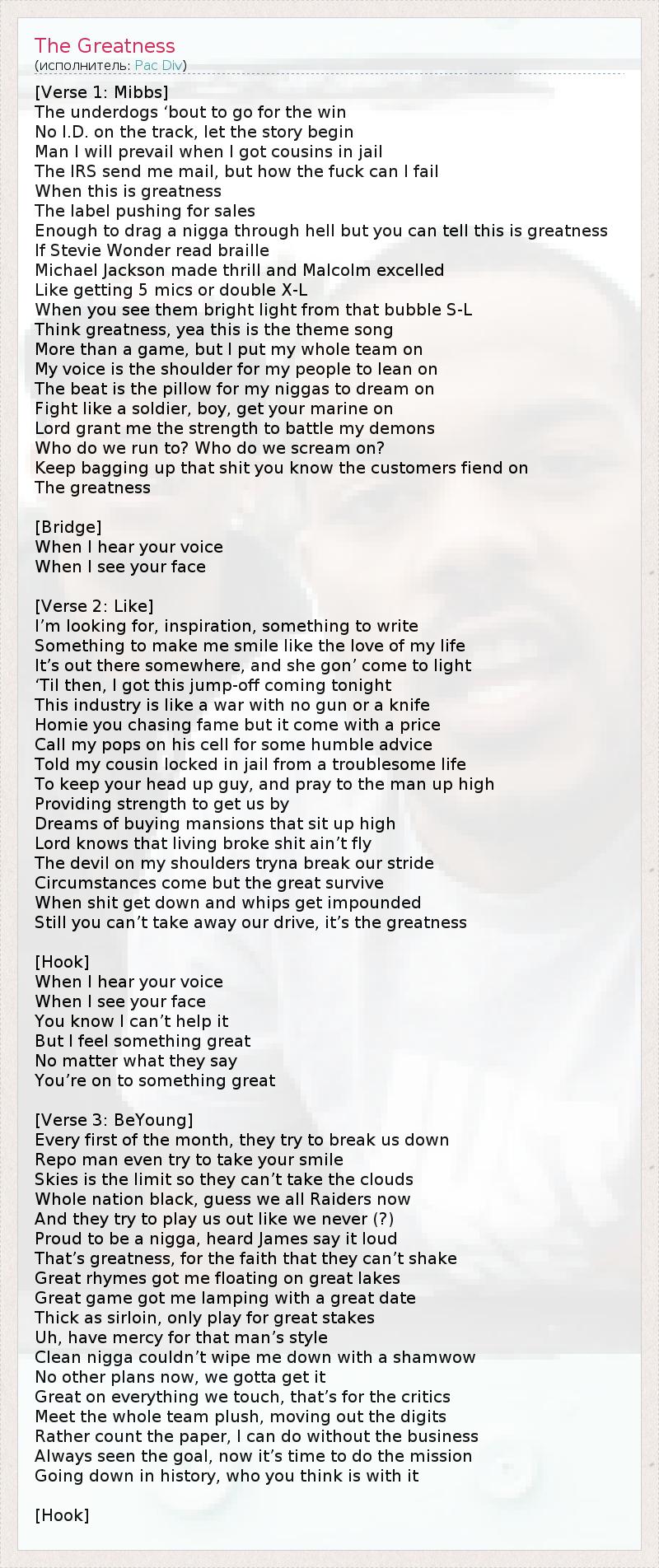 Это интересно:Pac Div (или Pacific Division) - хип-хоп трио из трех человек - братьев Mibbs и Like, а также их давний друг BeYoung. Все трое когда то учились в одной школе (Южная Калифорния). Дружба и любовь к музыке и породила группу Pac Div.Парни работают в стиле оригинального классического хип-хопа, чему они научились благодаря так называемой "золотой эре".В то время как... продолжение