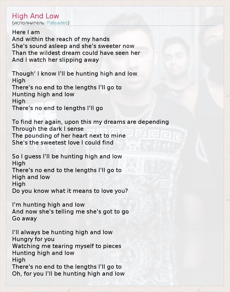 Here I am And within the reach of my hands She's sound asleep and she's sweeter now Than the wildest dream could have seen her And I watch her slipping away Though' I know I'll be hunting high and low High There's no end to the lengths I'll go to Hunting high and low High There's no end to lengths I'll go To find her again, upon this my dreams are depending Through the dark I sense The pounding of her heart next to mine She's the sweetest love I could find So I guess I'll be hunting high and low High There's no end to the lengths I'll go to High and low High Do you know what it means to love you? I'm hunting high and low And now she's telling me she's got to go Go away I'll always be hunting high and low Hungry for you Watching me tearing myself to pieces Hunting high and low High There's no end to the lengths I'll go to Oh, for you I'll be hunting high and low