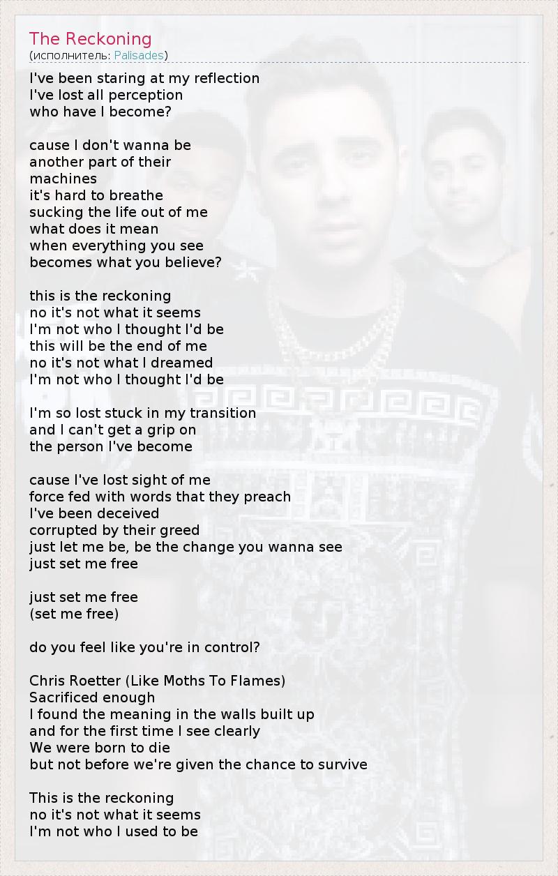 I've been staring at my reflection I've lost all perception who have I become? cause I don't wanna be another part of their machines it's hard to breathe sucking the life out of me what does it mean when everything you see becomes what you believe? this is the reckoning no it's not what it seems I'm not who I thought I'd be this will be the end of me no it's not what I dreamed I'm not who I thought I'd be I'm so lost stuck in my transition and I can't get a grip on the person I've become cause I've lost sight of me force fed with words that they preach I've been deceived corrupted by their greed just let me be, be the change you wanna see just set me free just set me free (set me free) do you feel like you're in control? Chris Roetter (Like Moths To Flames) Sacrificed enough I found the meaning in the walls built up and for the first time I see clearly We were born to die but not before we're given the chance to survive This is the reckoning no it's not what it seems I'm not who I used to be