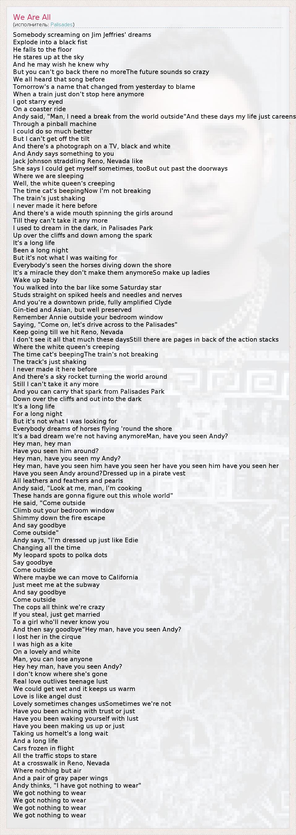 Это интересно:Группа из г. Иселин (Iselin), Нью Джерси, США. Образовались в 2008 году под именем "Marilyn Is Dead". В 2011 году, перейдя на лэйбл Rise Records, сменили название на "Palisades".На данный момент у группы 2 EP, но первая EP, "Appearance Disappear ", была записана в 2009 еще при старом названии. Вторая вышла в 2012 году под названием "I'm Not Dying Today".Дебютный альбом Outcasts вышел 20 мая 2013 года.... продолжение